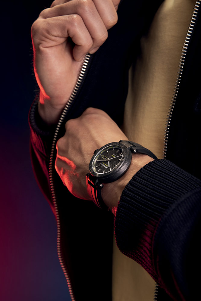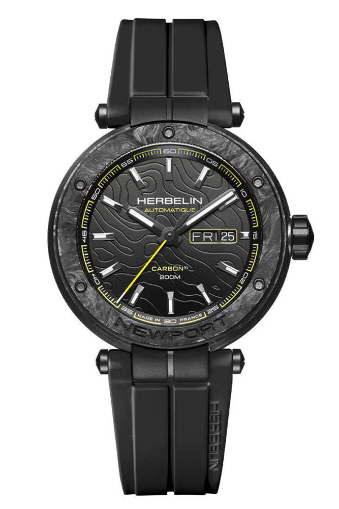 Herbelin Newport Carbon Titanium Automatic pánské hodinky . Francouzská časomíra s referenčním číslem 1788CTN14CA je kulaté karbonové pouzdro s titanovými prvky. Karbonové pouzdro kombinované s titanovými prvky zajistí pohodlné používání časomíry, a to díky své lehkosti a vysoké odolnosti vůči vodě, teplu, potu a korozi. Z přední strany pouzdra jsou vidět ozdobné šrouby a název kolekce Newport. Na očka karbonového pouzdra je připevněn černý pryžový řemínek FKM s titanovou přezkou potaženou DLC. Pod safírovým sklíčkem, které je extrémně těžké poškrábat, se ukrývá krásný černý ciferník s gilošovaným vzorem. Najdeme na něm lineární indexy, velké čitelné černé ručičky s luminiscenční hmotou a výraznou žlutou ručičku. Na ciferníku je také rozšířené zobrazení data s dnem v týdnu a měsícem na pozici 3 hodin.