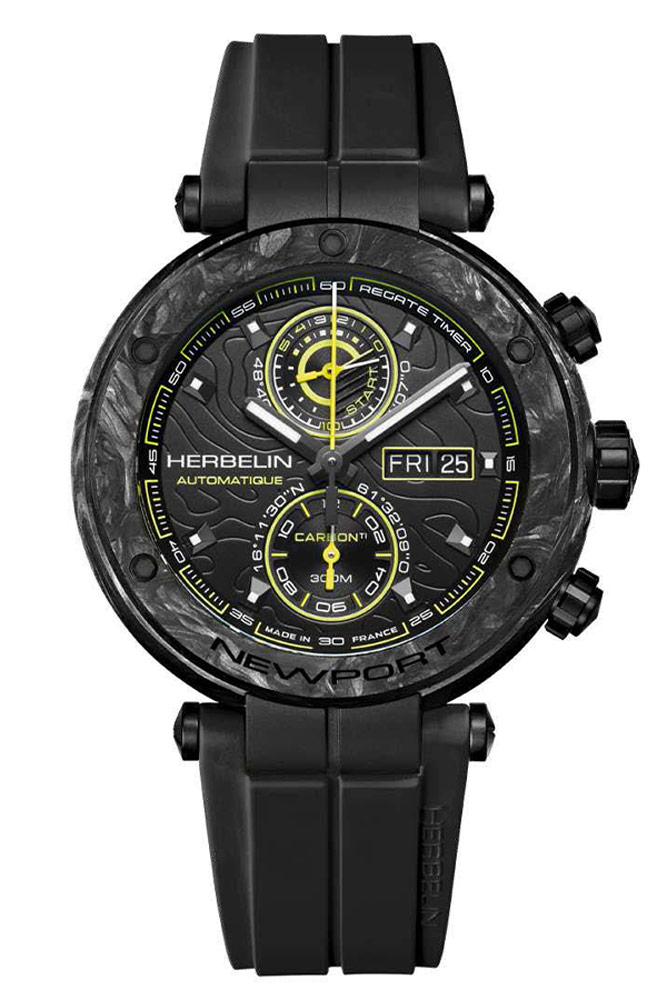 Luxusní pánské hodinky Herbelin Newport Carbon Titanium Automatic vydané v limitované edici, limitované na 500 kusů po celém světě. Francouzská časomíra s referenčním číslem 288CTN14CA je kulaté karbonové pouzdro s titanovými prvky. Karbonové pouzdro kombinované s titanovými prvky zajistí díky své lehkosti a vysoké odolnosti vůči teplu, vodě, potu a korozi vysoký komfort při používání hodinek. K uším karbonového pouzdra je připevněn černý gumový řemínek s titanovou přezkou potaženou DLC. Materiál řemínku je mnohonásobně odolnější než tradiční řemínky a po kontaktu s vodou se neznehodnocuje. Další výhodou je, že se snadno udržuje v čistotě. Pod safírovým sklíčkem, které je extrémně těžké poškrábat, se ukrývá krásný černý ciferník s gilošovaným vzorem. Na číselníku najdete bodové indexy, velké čitelné černé ručky s luminiscenční hmotou a výraznou žlutou ručku. Newport Carbon Titanium Automatic jsou hodinky především pro milovníky regat. Štít byl obohacen o speciální štíty, které jsou věnovány závodům plachetnic. Pod sklem dále najdete rozšířené zobrazení data s dnem v týdnu a měsícem na pozici 3 hodin.