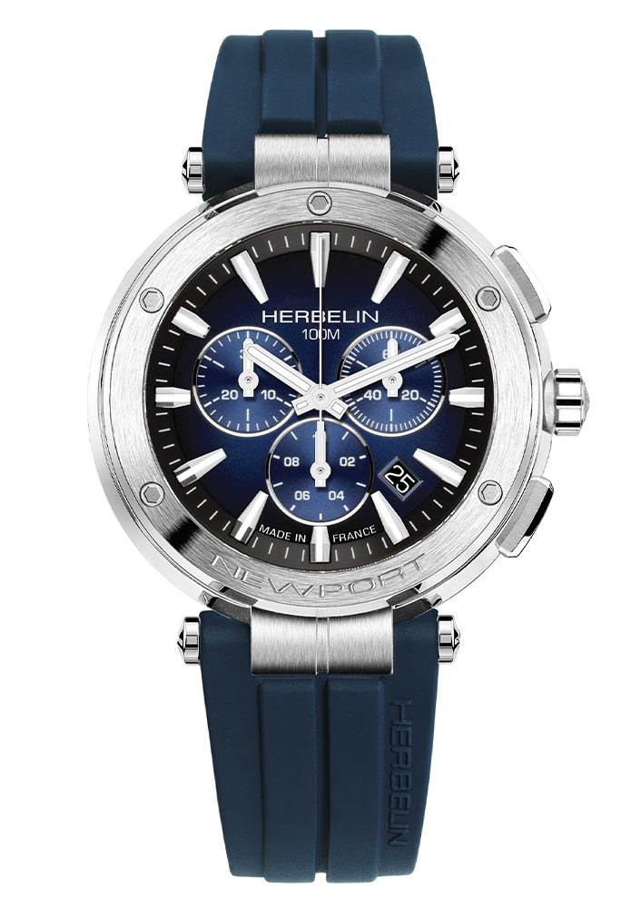 Pánské sportovní hodinky Herbelin Newport Chrono 37688A35CB v námořním stylu. Kulaté pouzdro o šířce 43 mm je vyrobeno z nerezové oceli ve stříbrné barvě. Ke kulatému pouzdru je připevněn modrý gumový pásek. Safírové sklo chrání modrý ciferník s lineárními indexy a funkcemi chronografu, což hodinkám dodává sportovní charakter. Hodinky mají také datumovku mezi 4. a 5. hodinou. Sportovní funkce lze ovládat tlačítky umístěnými na pravé straně pouzdra. Hodinky Herbelin Newport Chrono 37688/35CB jsou sportovní hodinky, které na zápěstí vypadají skvěle. Gumový řemínek zajistí pohodlné používání hodinek. Sportovcům se jistě bude hodit funkce chronografu.