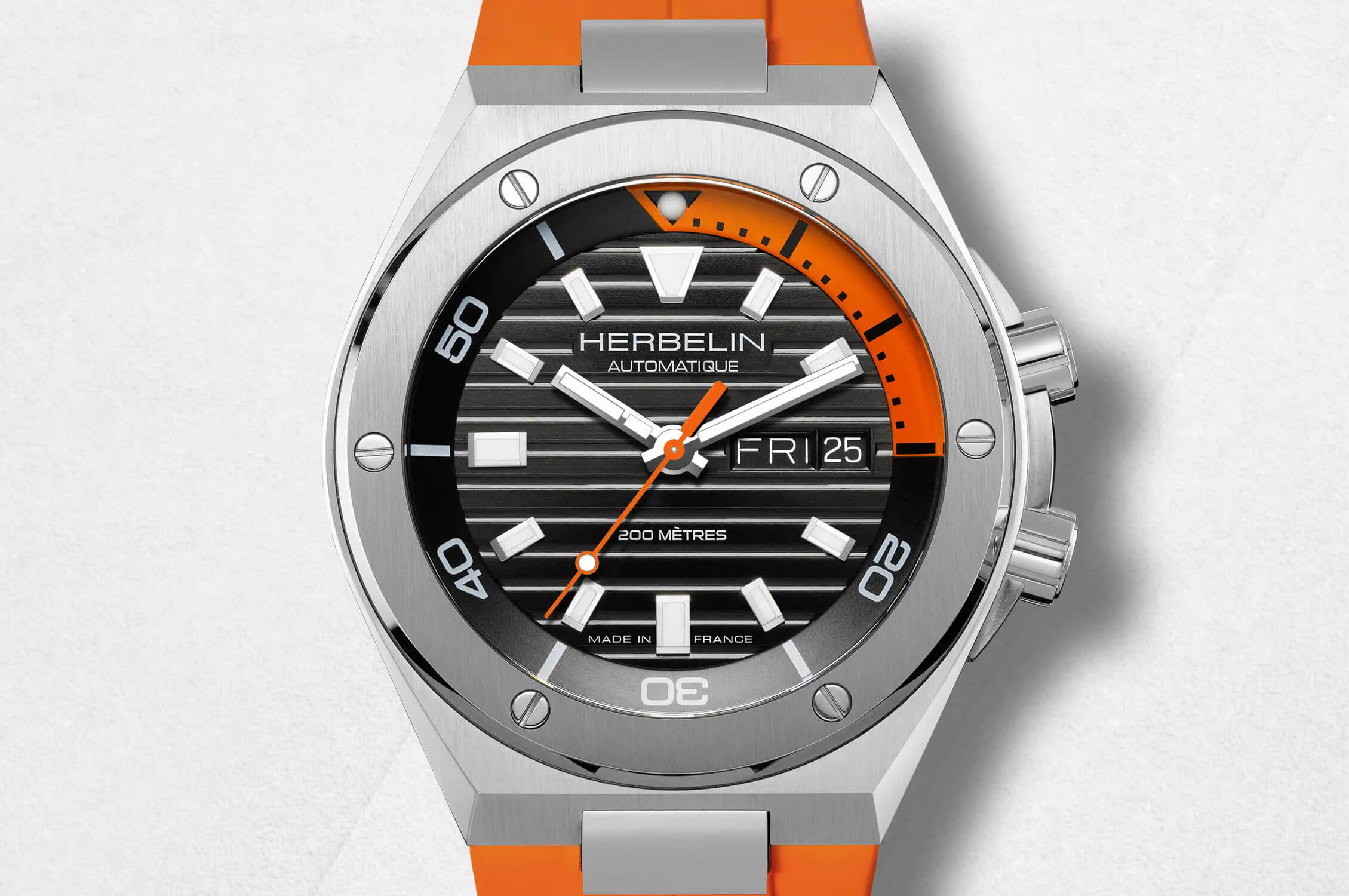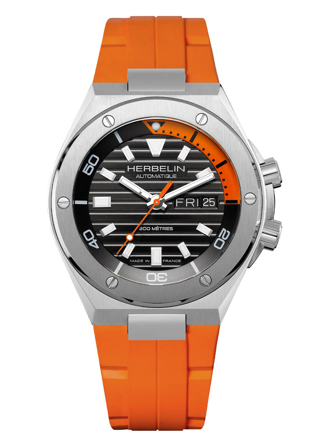 Sytě černý ciferník zdobený vodorovnými pruhy a velkými výraznými indexy hned dává tušit, že máme co do činění s modelem stvořeným pro muže, kteří se nebojí vyniknout. Čiré ruce a luminiscenční povlak zajišťují čitelnost v náročných podmínkách, což ocení především milovníci outdoorových dobrodružství. Kromě toho vám funkce denního data umožňuje mít kontrolu nad všemi nejdůležitějšími detaily každodenního života. Čím se však odlišuje od ostatních modelů, je solidní zpracování – francouzská preciznost je vidět v každém detailu.