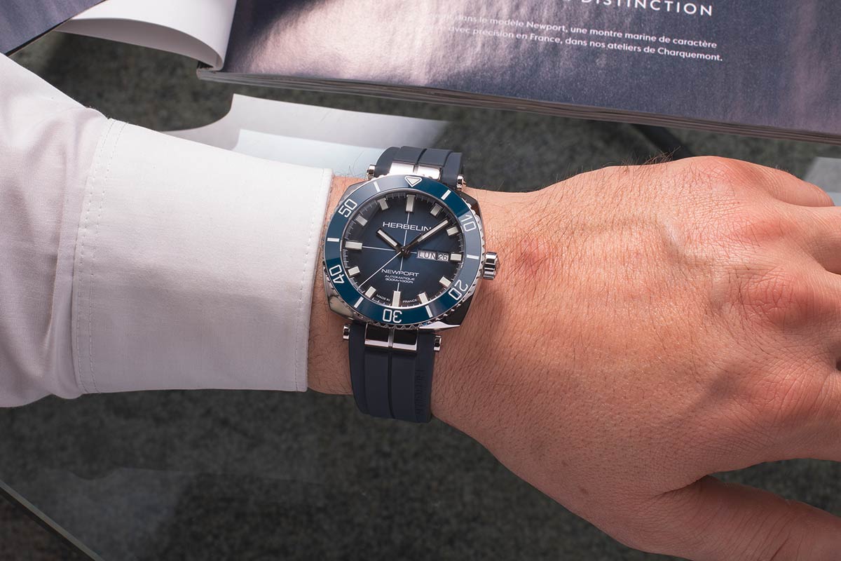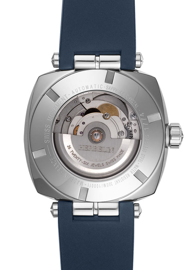 Automatické diverské hodinky francouzské značky Herbelin Newport Diver Automatic 1774BL15CB v námořním stylu. Čtvercové nerezové pouzdro o rozměrech 42 × 42 mm s otočným černým lesklým keramickým diverským kroužkem. Kulatý tvar prstence s drážkami, které poskytují lepší úchop při otáčení rámu pod vodou. Na zadní straně pouzdra najdeme šroubovací, prosklené pouzdro, které ukazuje pohled na automatický Machineek. Šroubovací korunka poskytuje větší zabezpečení proti poškození hodinek vodou. Modrý voděodolný gumový řemínek je měkký a pohodlný na nošení.