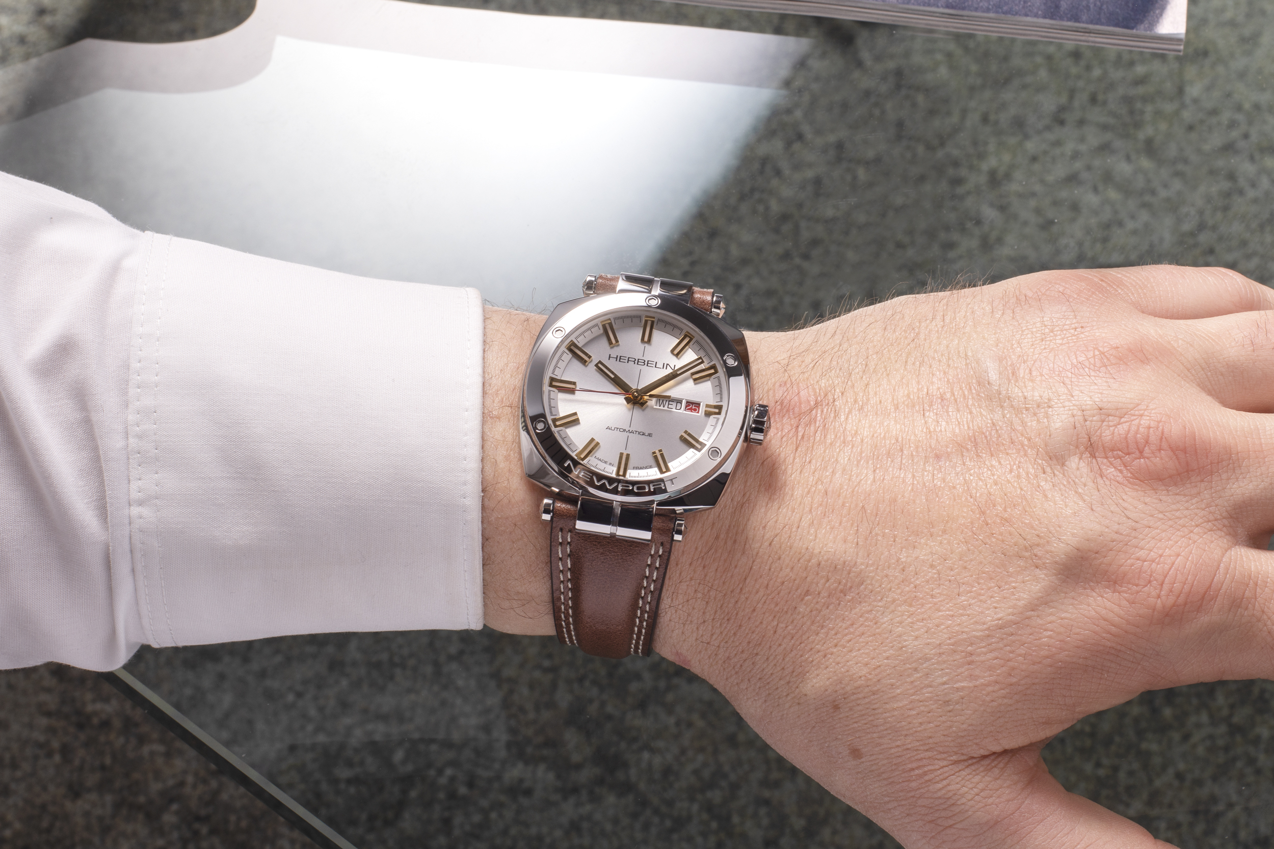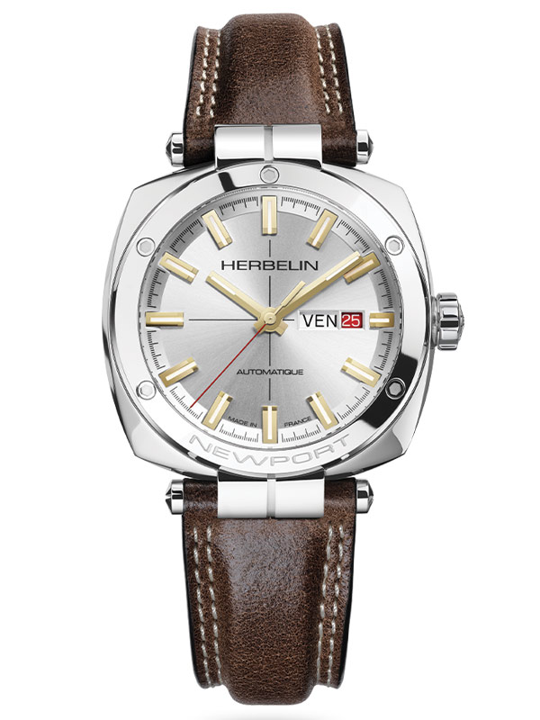 Hodinky Herbelin v námořním stylu jsou 100 metrů vodotěsné měřící zařízení , které visí na kaštanově hnědém koženém řemínku se zaobleným uprostřed a dvojitým prošitím v bílé barvě. Je vybavena švýcarským mechanickým Machinekem, který kmitá rychlostí 28 800 vibrací za hodinu a obsahuje 26 šperků. Oscilační závaží s rytinou „Herbelin“ je vidět přes průhledné zadní pouzdro. Hodinky byly navrženy, sestaveny, přizpůsobeny a testovány ve studiu Herbelina v pohoří Jura v regionu FrancheComté. Přesně tam, kde Newport Héritage čerpá svá měřítka, definovaná 75letou francouzskou hodinářskou tradicí, předávanou z otce na syna.