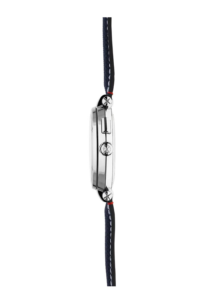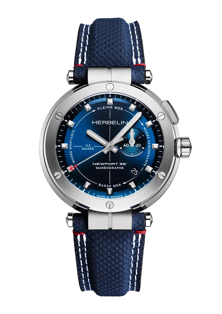 Pánské hodinky Herbelin Newport Mareographe 35TH Anniversary 24688A15 mají kulaté pouzdro z nerezové oceli, které nerezaví. Na pravé straně pouzdra je korunka a funkční tlačítko. Luneta pouzdra je zdobena šesti šrouby. Výrobce spároval 43mm pouzdro s lehkým látkovým řemínkem. Modrý textilní materiál je zespodu vyztužený přírodní kůží. Řemínek na zápěstí se zapíná na klasickou přezku. Na rubu hodinek je celá konstrukce uzavřena ocelovým krytem s rytinou v podobě volantu.