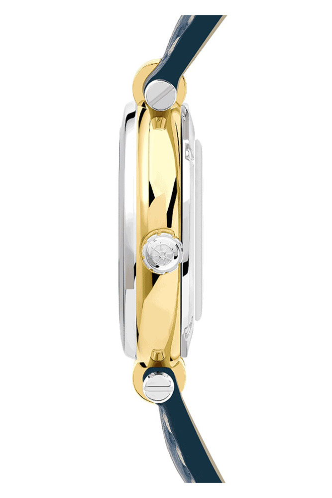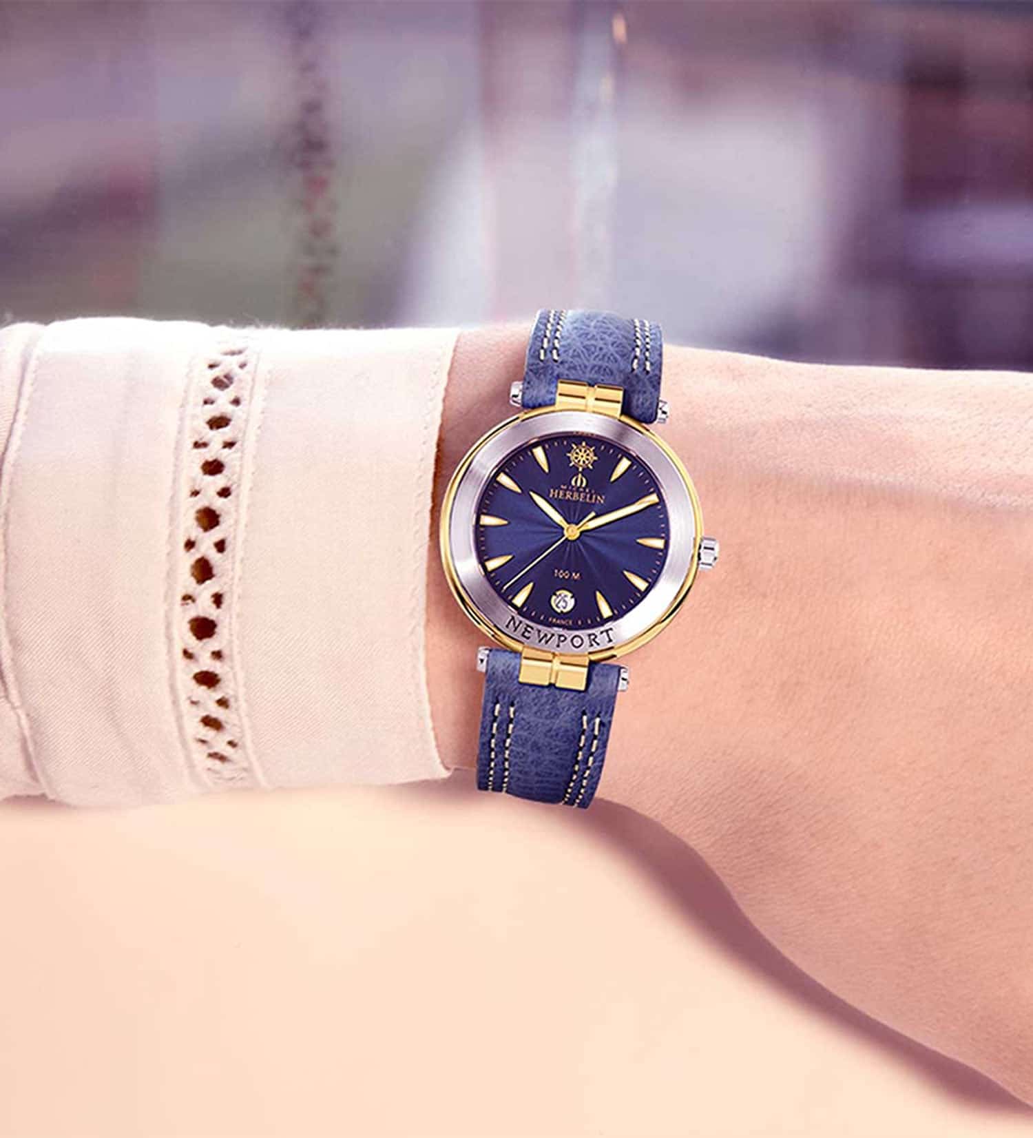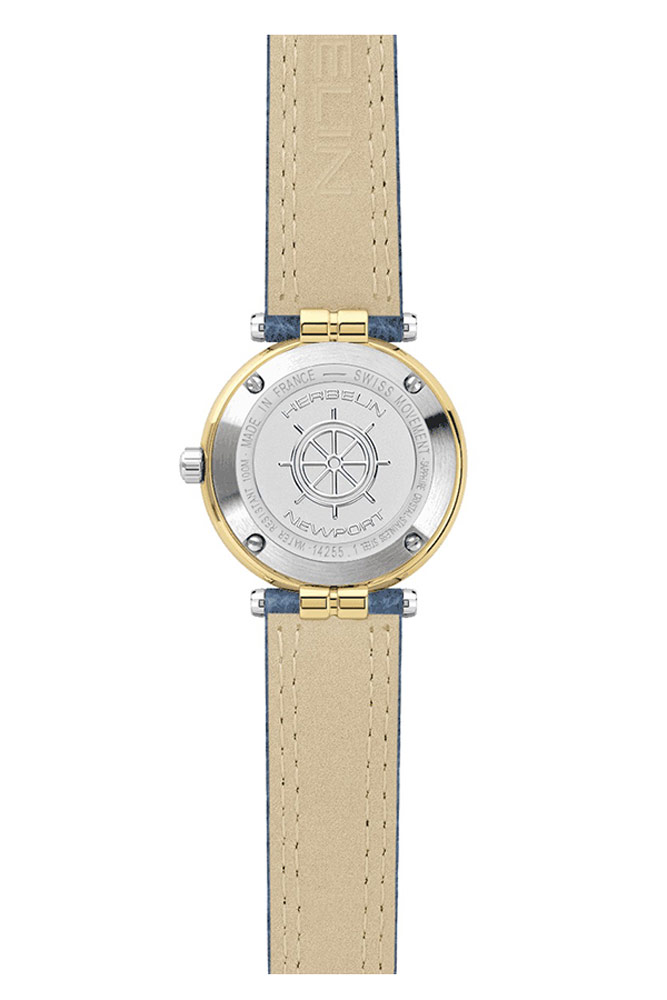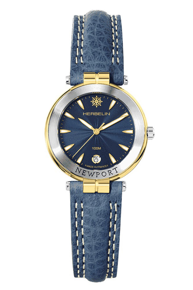 Francouzská značka Herbelin představuje model dámských hodinek z námořní kolekce Newport Originals. Hodinky Newport Originals 14255T35, obdařené silnou osobností, jsou inspirovány průzory transatlantických lodí. Kulaté pouzdro je vyrobeno z nerezové oceli ve dvou barvách. Zepředu je vidět stříbrná luneta, která je na pozlacenou část aplikována metodou PVD. Pozoruhodnou krajku zdobí krásný gravírovaný volant. Pod tvrdým a těžko poškrábatelným safírovým sklíčkem se nachází modrý lesklý ciferník. Číselník obsahuje lineární indexy ve tvaru lodi, ostré ručky s luminiscenční hmotou a kulaté datumové okénko na pozici šest hodin. Zajímavým doplňkem ciferníku je krásný volant umístěný na pozici dvanácti hodin. K dvoubarevným výstupkům pouzdra je připevněn kožený řemínek. Řemínek je modrý s jasným prošíváním a má tradiční zapínání na přezku.