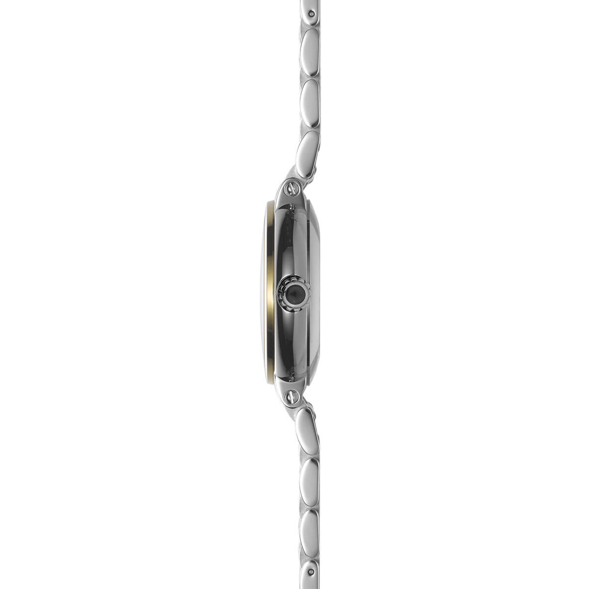 Kulaté pouzdro o průměru 35 mm, vyrobené z nejkvalitnější nerezové oceli, vyzařuje eleganci a odolnost. Pozlacená luneta má ozdobné šrouby a název námořní kolekce Newport, který okamžitě upoutá pozornost. Na zadní straně pouzdra je skleněný kryt, který umožňuje obdivovat precizní automatický mechanismus. Na pravé straně pouzdra je korunka zdobená decentní rytinou volantu, která odkazuje na námořní tradice kolekce Newport. Hodinky doplňuje ocelový stříbrný a zlatý náramek s motýlkovým zapínáním, dokonale ladící k celku.
