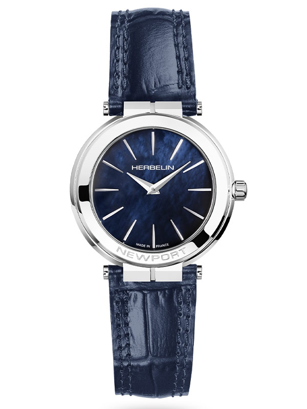 Elegantní dámské hodinky přímo z Francie Herbelin Newport Slim 16922AP60BL. Kolekce hodinek Newport Slim jsou hodinky se super tenkým pouzdrem. Pouzdro o tloušťce pouhých 6 mm umožňuje velmi pohodlné používání hodinek. Pouzdro je vyrobeno z nerezové oceli ve stříbrné barvě. Na přední straně je kulatá lesklá luneta s ozdobou v podobě názvu jachtařské kolekce NEWPORT. Na pouzdro hodinek 16922AP60BL je připevněn kožený řemínek, což je další prvek zajišťující pohodlí při používání těchto náramkových hodinek. Safírové sklo, extrémně tvrdé a těžko poškrábatelné, chrání krásný perleťový ciferník s elegantními ručičkami a dlouhými lineárními indexy. Na horní části štítu je hrdé logo značky Herbelin.