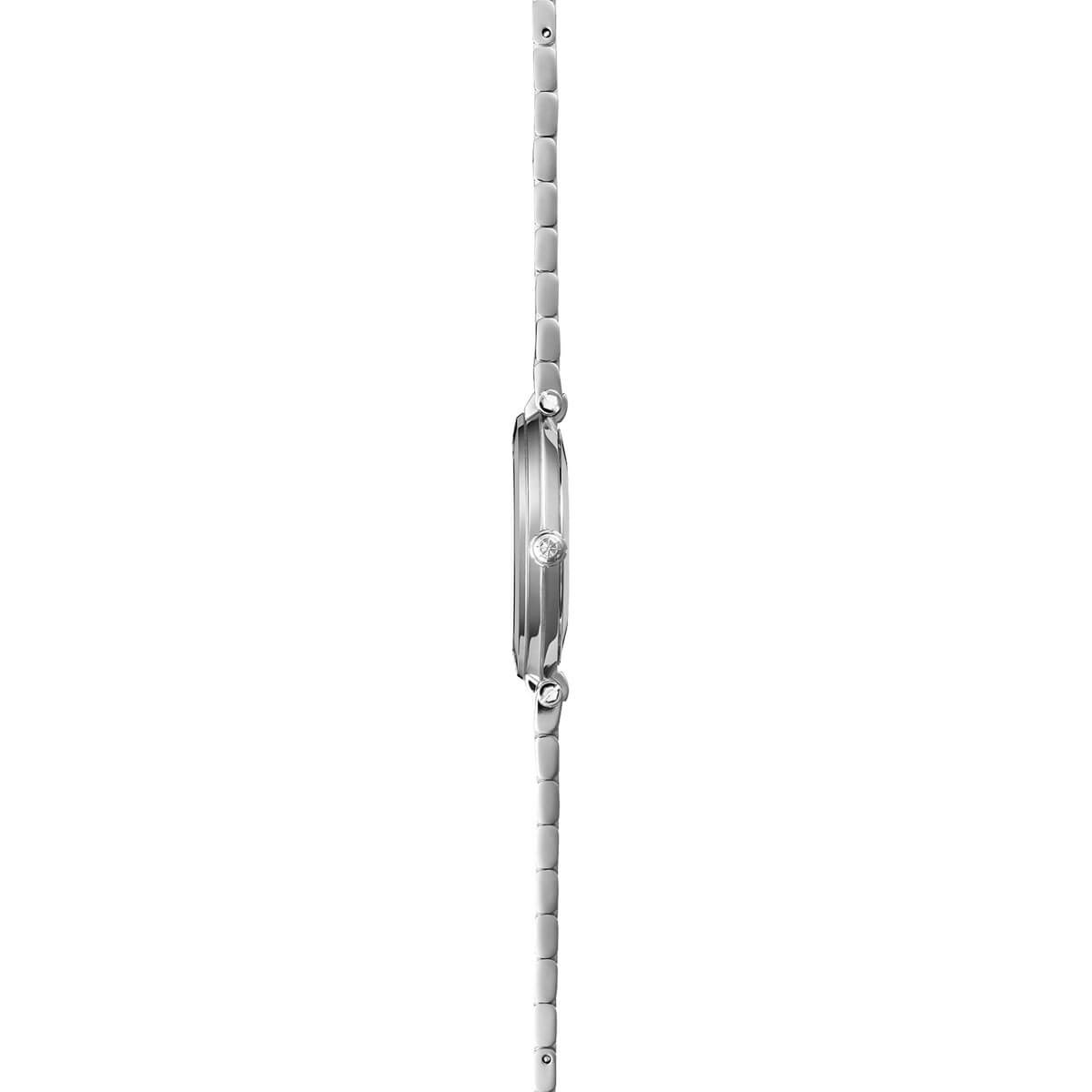 Pouzdro o průměru 32 mm a tloušťce pouhých 5,85 mm je ztělesněním pohodlí a jemnosti – vyrobené z ušlechtilé oceli, harmonicky propojené s jemným, ale pevným náramkem. Ochranu zajišťuje safírové sklíčko, které odolává poškrábání a dlouhodobě si uchovává svou čirost. Uvnitř pracuje přesný švýcarský strojek Ronda – spolehlivý a bezúdržbový, ideální pro každodenní nošení.