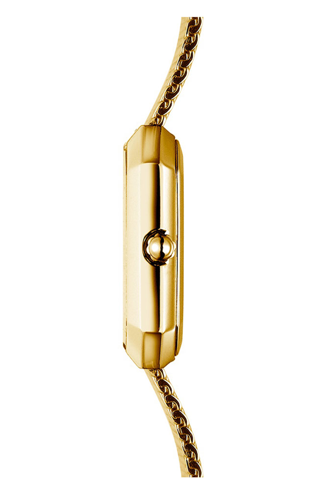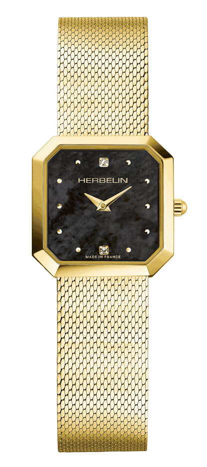 Francouzská značka Herbelin představuje krásné bižuterní dámské hodinky z kolekce Octogone. Čtvercové pouzdro z nerezové oceli zlaté barvy s PVD povlakem. K pouzdru byl připevněn jemný náramek MESH. MESH náramky se pyšní nízkou hmotností a snadným nastavením na zapínání. Tmavě perleťový ciferník chrání safírové sklo vysoce odolné proti poškrábání. Ciferník má pozlacené dýkové ručičky a jemné tečky na celých hodinách. Příchutí je přidání zirkonových kamenů na dvanácté a šesté hodině. Srdce hodinek je ukryto pod perleťovým ciferníkem. Ronda 751 je švýcarský Machineek napájený baterií. Jedná se o velmi oblíbené řešení, které zajistí velmi dobrý chod hodinek po dlouhou dobu používání. Vodotěsnost hodinek s hodnotou 3 atmosféry umožňuje menší postříkání.