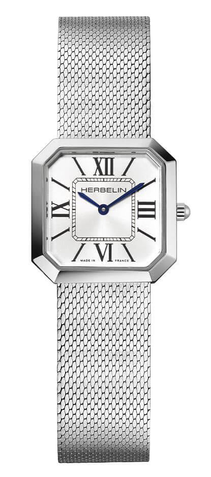 Materiálové provedení Herbelin Octogône je spojením francouzské preciznosti s každodenním pohodlím a odolností. Leštěné pouzdro z ušlechtilé oceli měří 24 x 24 mm a přitahuje pozornost svou ostrou, geometrickou linií, která krásně kontrastuje s jemným leskem milánského síťovaného náramku. Hodinky se dokonale přizpůsobí zápěstí a zajišťují pohodlí při nošení po celý den. Jemné zapínání se dokonale začleňuje do tvaru náramku a nenarušuje jeho celistvost. Celý model chrání safírové sklíčko, odolné proti poškrábání a matnění — detail, který nenápadně podtrhuje vysokou kvalitu zpracování. Herbelin tímto modelem dokazuje, že odolnost a elegance mohou jít ruku v ruce bez kompromisů.
