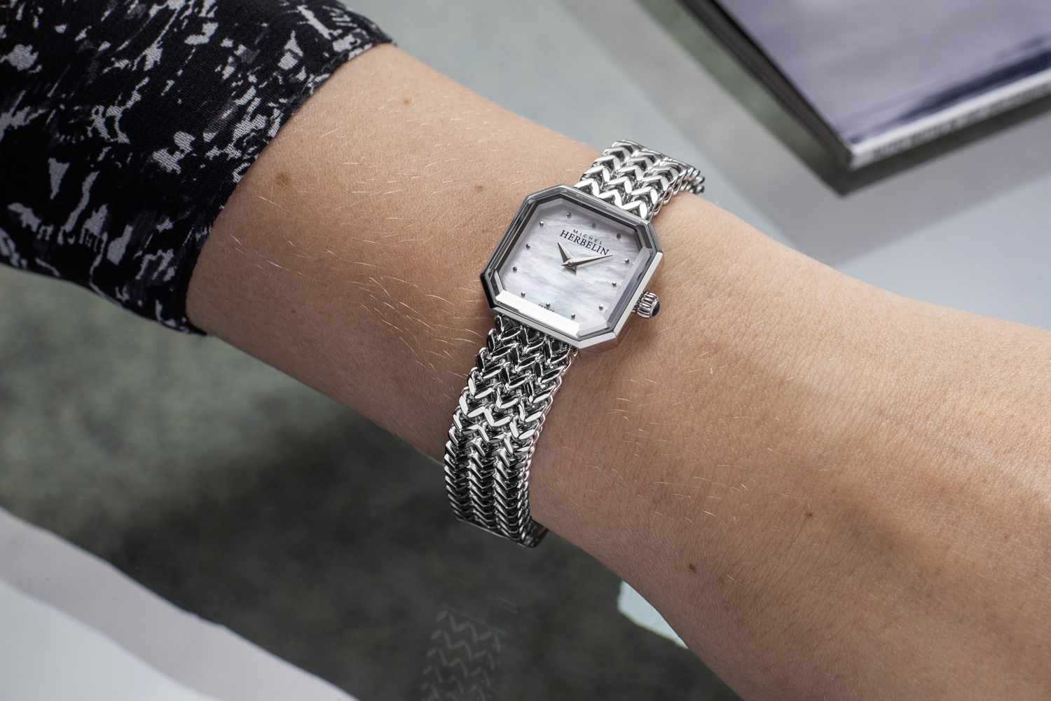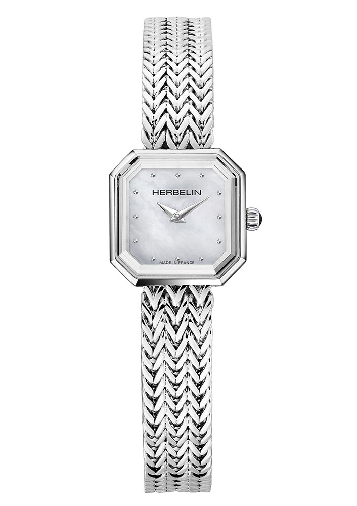Pozlacený náramek z rybí kosti, inspirovaný dědictvím francouzského domu Herbelin, vyzařuje styl 50. let. Náramek ze tří řad díky své mimořádné měkkosti dokonale přilne k celému povrchu zápěstí. Perleťové stříbrné hodinky z kolekce Octogône jsou nejkvalitnějšími klenotnickými hodinkami, které představují dokonalost francouzské hodinářské tradice Herbelin, která se zrodila před 75 lety v Charquemontu. Tento nový ženský model, který kombinuje vysoce kvalitní materiály a švýcarský Machineek, punc přesnosti a spolehlivosti, vyzařuje nadčasové kouzlo.