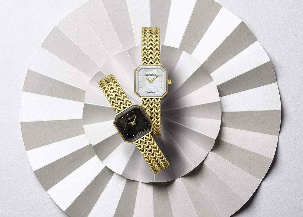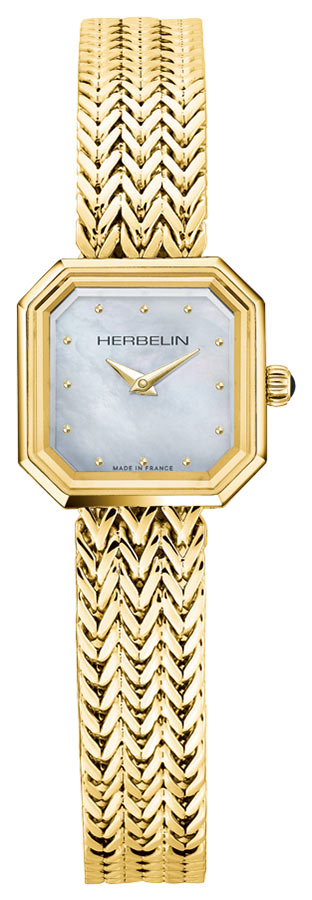 Pozlacený náramek z rybí kosti, inspirovaný dědictvím francouzského domu Herbelin, vyzařuje styl 50. let. Náramek ze tří řad díky své mimořádné měkkosti dokonale přilne k celému povrchu zápěstí. Pozlacené perleťové hodinky z kolekce Octogône jsou nejkvalitnějšími klenotnickými hodinkami, které představují dokonalost francouzské hodinářské tradice Herbelin, která se zrodila před 75 lety v Charquemontu. Kombinace vysoce kvalitních materiálů a švýcarského Machineku, punc přesnosti a spolehlivosti, tento nový dámský