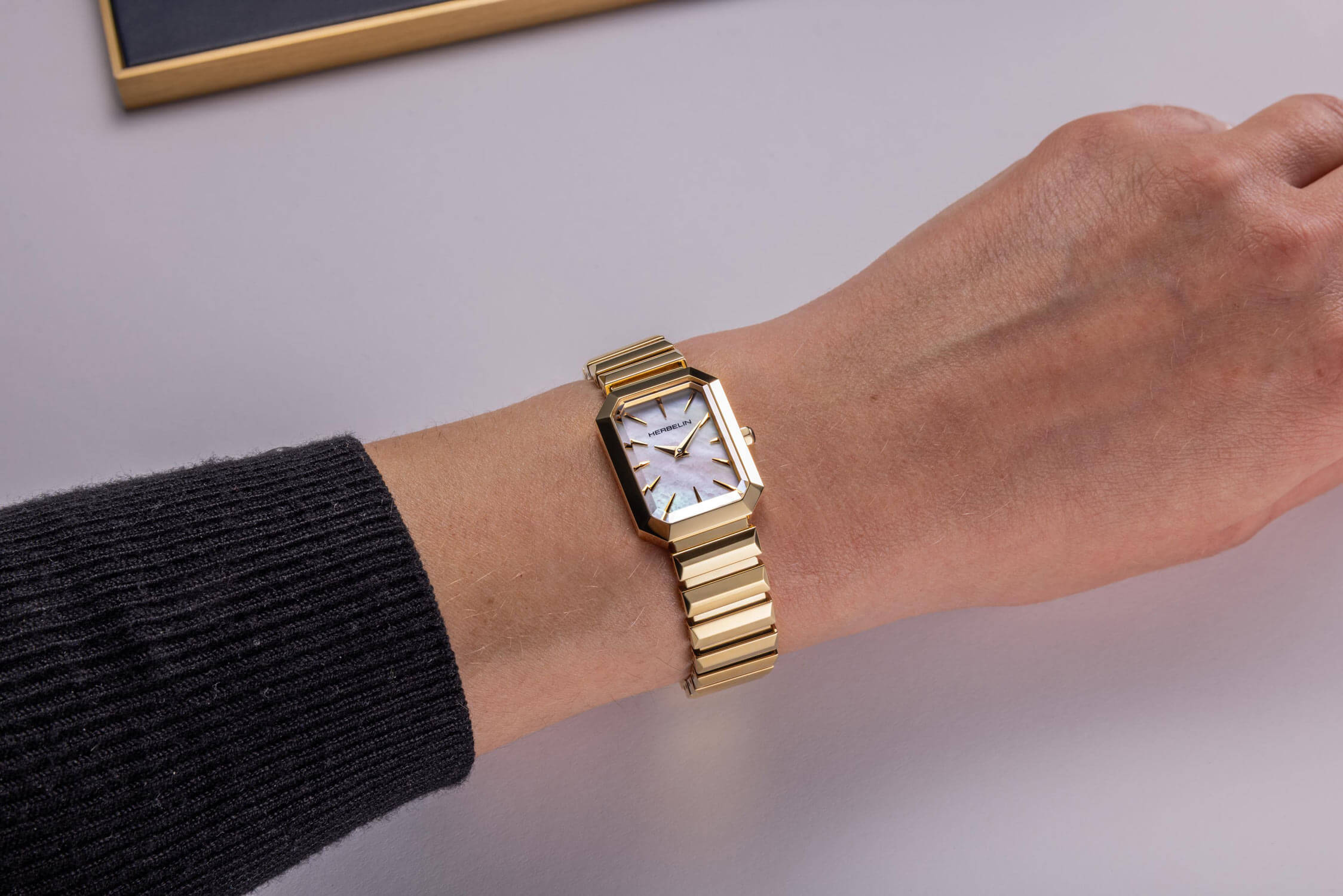 Štíhlé pouzdro o tloušťce 7,2 mm je vyrobeno z nerezové oceli 316L a spojeno s facetovaným náramkem s lesklou povrchovou úpravou, který se dokonale přizpůsobuje zápěstí. Prezentovaný model je pokryt povlakem PVD ve zlaté barvě, což mu dodává další šmrnc a usnadňuje kombinaci s různými šperky. Celé hodinky chrání odolné safírové sklíčko, zatímco vodotěsnost do 50 metrů zajišťuje, že doprovázejí svou nositelku nejen na schůzkách, ale i během každodenního shonu. Uvnitř pracuje švýcarský quartzový strojek Ronda – přesný, spolehlivý, nenápadný, ale nepostradatelný.
