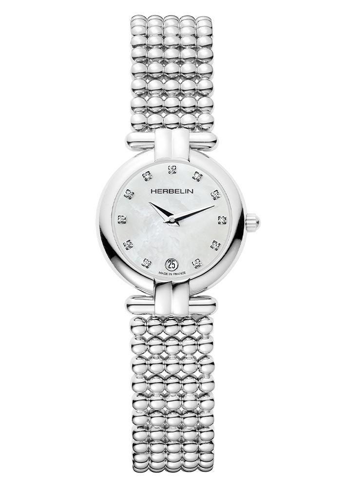 Šperky a elegantní dámské hodinky francouzské značky Herbelin z kolekce Perles s referenčním číslem 16873B59. Kulaté stříbrné pouzdro z nerezové oceli. Nevšední náramek v podobě spojených ocelových kuliček se vzhledem stříbrné perly. Perleťový ciferník s kubickými zirkony na hodinových bodech a datumovkou na pozici šesté hodiny. Hodinky Herbelin 16873B59 z kolekce Perles jsou jemným dívčím modelem se šperkovým náramkem a doplňkem v podobě zirkonových kamenů na světlém ciferníku. Hodinky se budou jistě vyjímat na zápěstí každé ženy. Jemný náramek zpříjemní používání časomíry. Hodinky svým vzhledem vyniknou od ostatních klasických časomíry.