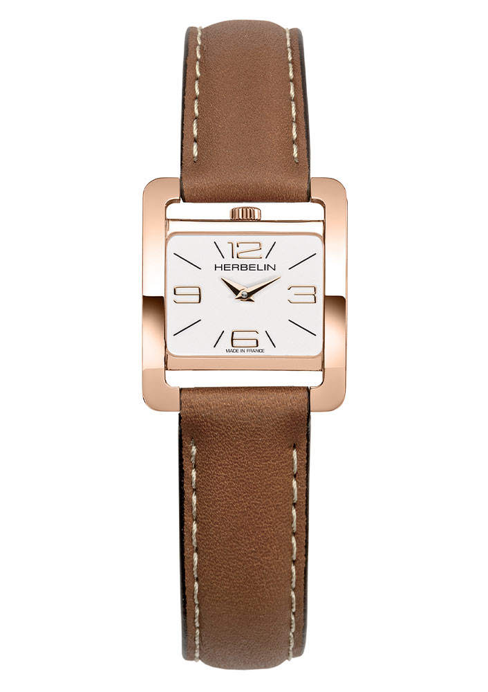 Dámské klasické hodinky Herbelin V Avenue 17137PR11GD. Obdélníkové růžové zlaté pouzdro z nerezové oceli s PVD povlakem. Korunka je umístěna v horní části pouzdra. Hnědý řemínek z pravé kůže s bílým prošíváním a zapínáním na přezku. Analogový ciferník v bílé barvě s lineárními indexy a arabskými číslicemi je krytý safírovým sklem.