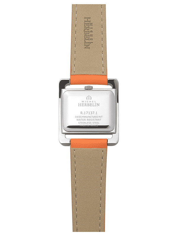 Dámské klasické hodinky Herbelin V Avenue 17137TR11MD. Obdélníkové pouzdro ve stříbrné barvě vyrobené z nerezové oceli. Korunka je umístěna v horní části pouzdra. Oranžový řemínek z pravé kůže s klasickým zapínáním na přezku. Bílý analogový ciferník s lineárními indexy a arabskými číslicemi krytý safírovým sklem vyznačujícím se vysokou tvrdostí.