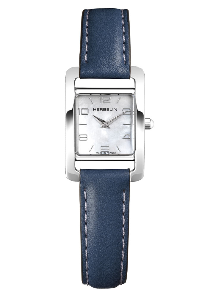 Dámské klasické hodinky francouzské značky Herbelin V Avenue 17437AP29BL. Obdélníkové pouzdro o šířce 21 mm ve stříbrné barvě z nerezové oceli. Modrý řemínek z pravé kůže se zapínáním na přezku. Perleťový analogový číselník s lineárními indexy a arabskými číslicemi je krytý safírovým sklem.
