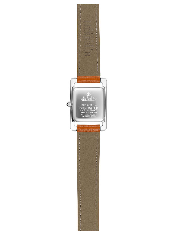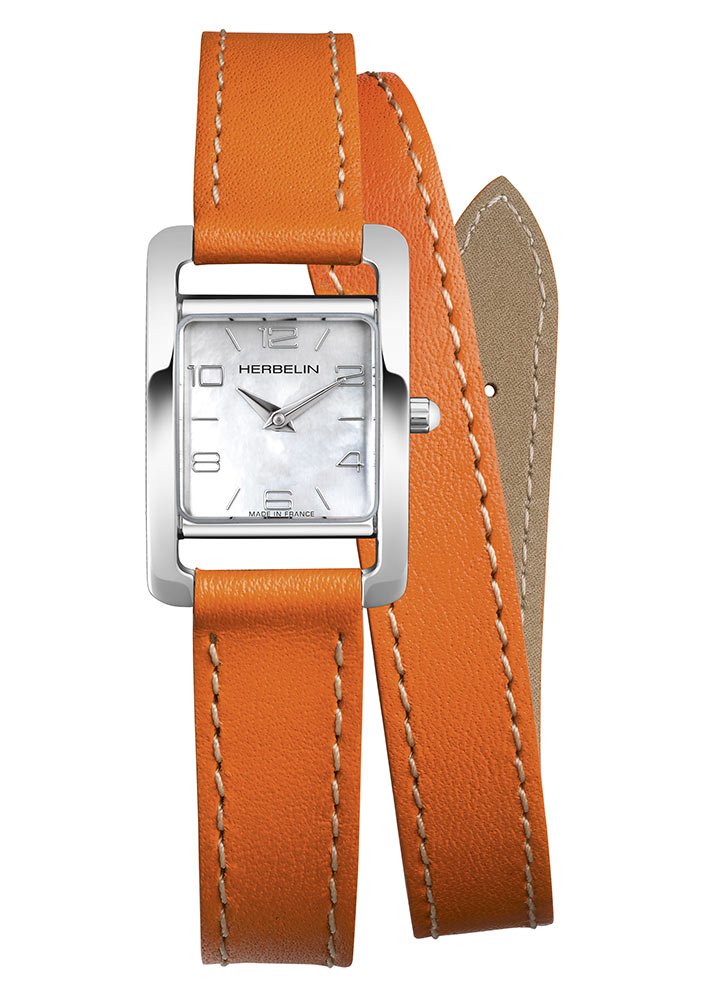 Dámské klasické hodinky francouzské značky Herbelin V Avenue 17437AP29MDL. Obdélníkové pouzdro o šířce 21 mm ve stříbrné barvě z nerezové oceli. Oranžový řemínek z pravé kůže s dvojitým obepnutím kolem zápěstí se zapínáním na přezku. Perleťový analogový číselník s lineárními indexy a arabskými číslicemi je krytý safírovým sklem.