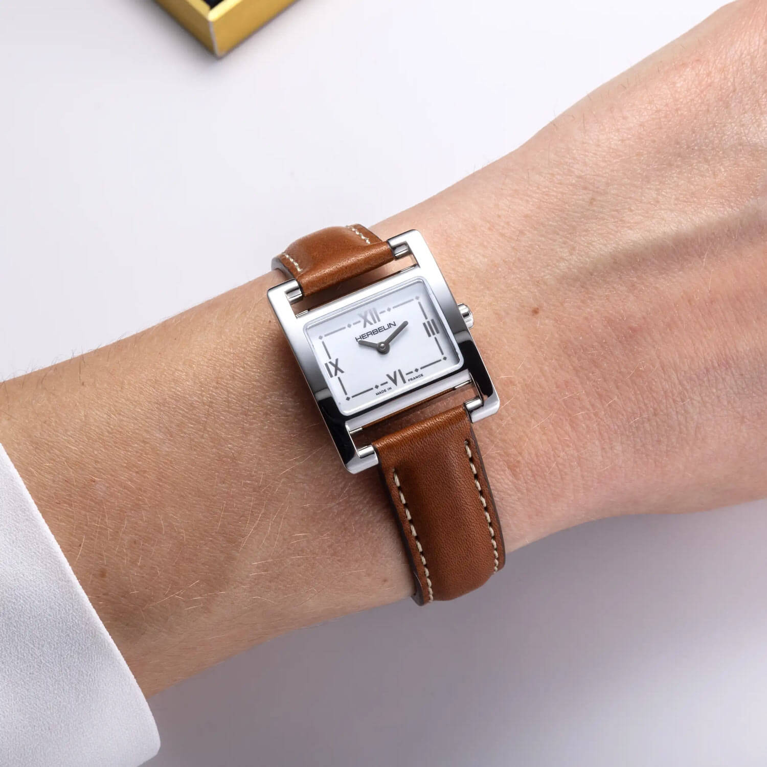 Pouzdro hodinek o rozměrech 23.40 x 19 mm je vyrobeno z kvalitní nerezové oceli ve stříbrné barvě. Ocel dodává hodinkám mimořádný lesk a odolnost vůči různým druhům koroze. Obdélníkový tvar jim dodává jedinečný charakter a odlišuje je od ostatních modelů. Zadní strana pouzdra je z oceli a dokonale uzavírá celou konstrukci. K hodinkám je připevněn řemínek z přírodní kůže v jemné hnědé barvě, který nejenže zajišťuje elegantní vzhled, ale také pohodlné nošení. Jeho měkký a lehký materiál zajišťuje, že se hodinky Herbelin příjemně přizpůsobí zápěstí.