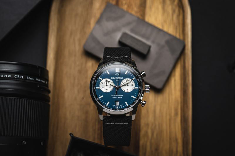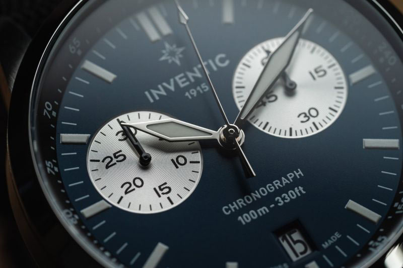 Tmavě modrý ciferník se stříbrnými počítadly a černým kroužkem tachymetru, zmíněný ve vysvětlení funkce, je chráněn minerálním sklem K1. Jedná se o mimořádně praktický typ skla , který kombinuje vlastnosti běžného minerálního skla a safírového skla. Od prvního přebírá minerální sklo K1 odolnost proti rozbití a od druhého - proti poškrábání, díky čemuž hraje roli optimálního řešení pro každodenní použití. Perfektně viditelné indexy, hodinová a minutová ručka, stejně jako hrot vteřinové ručičky jsou vyplněny kvalitní luminiscenční hmotou. Svítivá výplň zaručuje čitelnost i po setmění nebo v místnosti se špatným osvětlením. Za zvážení stojí i typ povrchové úpravy jak ciferníku, tak pouzdra. Co se týče ciferníku, ten má matnou texturu. Pokud jde o pouzdro, bylo dokončeno v rohoži metodou vertikálního kartáčování. Luneta vyleštěná do vysokého lesku s ní vytváří elegantní kontrast. Křemenný chronograf pro muže Inventic je zavěšen na černém nylonovém řemínku, který dotváří jedinečný vzhled těchto všestranných hodinek.
