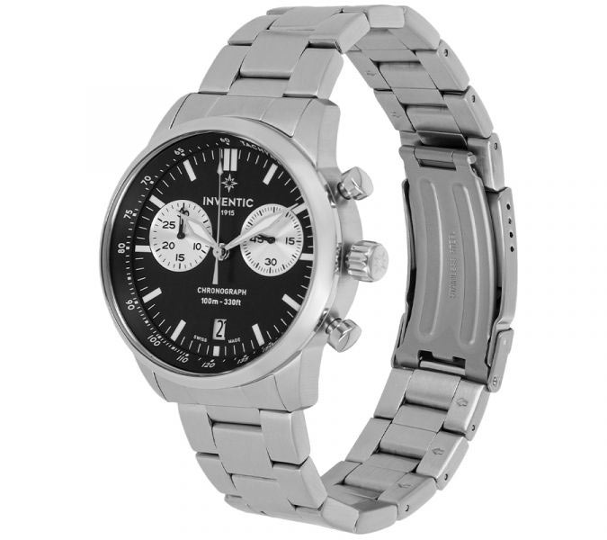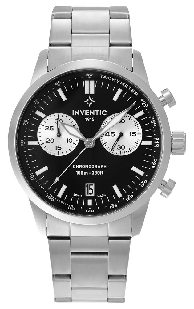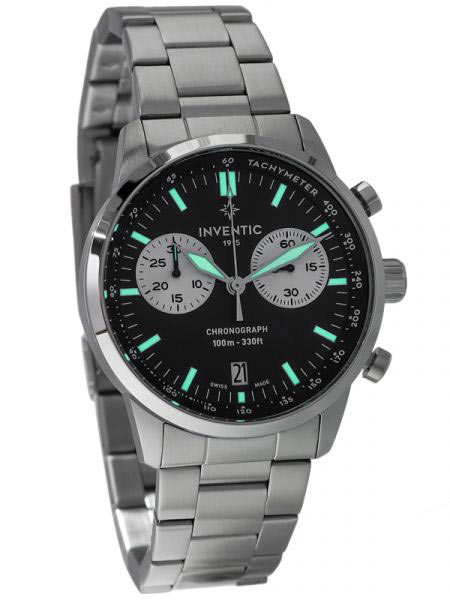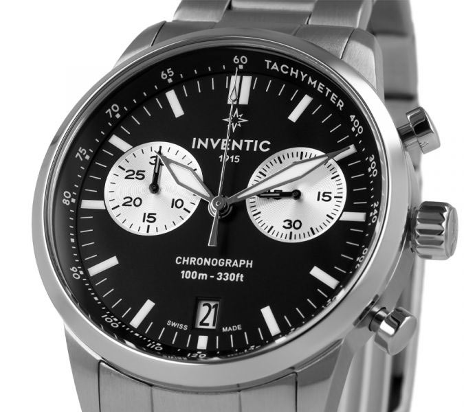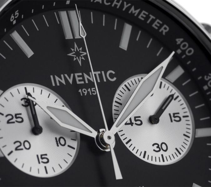 Černý ciferník se stříbrnými počítadly a černým kroužkem tachymetru, zmíněný ve vysvětlení funkce, je chráněn minerálním sklem K1. Jedná se o mimořádně praktický typ skla , který kombinuje vlastnosti běžného minerálního skla a safírového skla. Od prvního přebírá minerální sklo K1 odolnost proti rozbití a od druhého - proti poškrábání, díky čemuž hraje roli optimálního řešení pro každodenní použití. Perfektně viditelné indexy, hodinová a minutová ručka, stejně jako hrot vteřinové ručičky jsou vyplněny kvalitní luminiscenční hmotou. Svítivá výplň zaručuje čitelnost i po setmění nebo v místnosti se špatným osvětlením. Za zvážení stojí i typ povrchové úpravy jak ciferníku, tak pouzdra. Co se týče ciferníku, ten má matnou texturu. Pokud jde o pouzdro, bylo dokončeno v rohoži metodou vertikálního kartáčování. Luneta vyleštěná do vysokého lesku s ní vytváří elegantní kontrast. Křemenný chronograf pro muže Inventic je zavěšen na třířadém náramku z nerezové oceli, který dotváří jedinečný vzhled těchto všestranných hodinek.