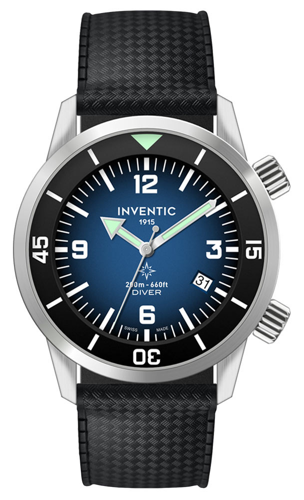 Tmavě modrý ciferník s matným přechodovým efektem obsahuje luminiscenční indexy, číslice a sportovní ručičky. Datumové okénko je asymetricky umístěno na 4. hodině. Černý silikonový hybridní řemínek ladí s černou otočnou lunetou na okraji ciferníku. Ciferník kompresorových hodinek Inventic je mimořádně čitelný jak díky kombinaci arabských a lineárních indexů, tak i díky luminiscenční vrstvě, kterou byly indikacemi pokryty. Další zvláštností těchto hodinek je typ skleněného krytu ciferníku. Jedná se o mimořádně praktické minerální sklo typu K1. Toto sklo slouží jako alternativní, optimální řešení pro nejlepší ochranu ciferníku náramkových hodinek každý den. Jeho specifičnost spojuje nejdůležitější přednosti minerálního skla a safírového skla, přičemž nedědí jejich nedokonalosti. Minerální sklo K1 je díky tomu působivě odolné proti poškrábání a přitom vysoce odolné proti rozbití .