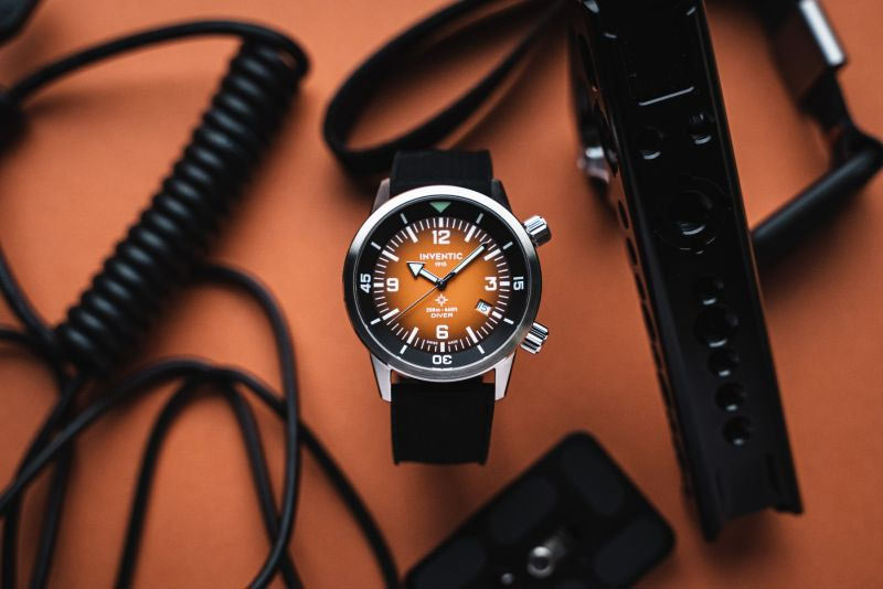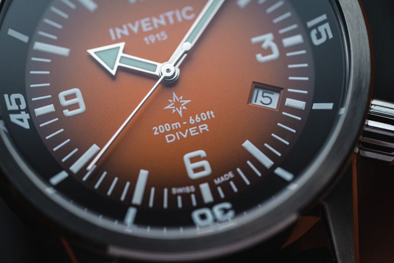 Oranžový ciferník s matným povrchem s gradientním efektem se vyznačuje svítícími indexy, číslicemi a sportovními ručičkami podsvícenými luminiscenční výplní. Datumové okénko je asymetricky umístěno na 4. hodině. Černý silikonový hybridní řemínek ladí s černou otočnou lunetou na okraji ciferníku. Ciferník kompresorových hodinek Inventic je mimořádně čitelný jak díky kombinaci arabských a lineárních indexů, tak i díky luminiscenční vrstvě, kterou byly indikacemi pokryty. Další zvláštností těchto hodinek je typ skleněného krytu ciferníku. Jedná se o mimořádně praktické minerální sklo typu K1. Toto sklo slouží jako alternativní, optimální řešení pro nejlepší ochranu ciferníku náramkových hodinek každý den. Jeho specifičnost spojuje nejdůležitější přednosti minerálního skla a safírového skla, přičemž nedědí jejich nedokonalosti. Minerální sklo K1 je díky tomu působivě odolné proti poškrábání a přitom vysoce odolné proti rozbití .