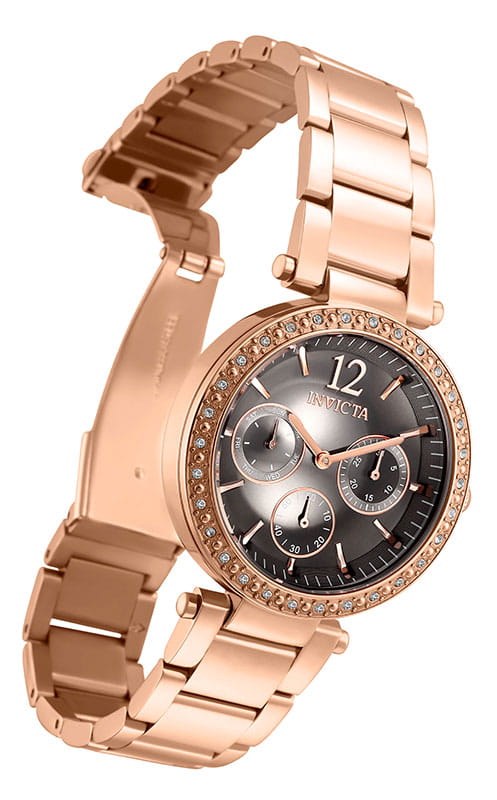 Krásné, elegantní a podmanivé dámské hodinky Invicta Angel 29926 s úžasným šedým ciferníkem. Pouzdro z nerezové oceli pozlacené růžovým zlatem je zdobeno krystaly, které dodávají jiskru. Pouzdro je shora uzavřeno sklem Flame Fusion . Jde o vynález Invicta , který kombinuje dvě nejdůležitější vlastnosti minerálního a safírového skla. Pokud narazí, neroztříští se na milion kousků, jen se roztříští. To je velmi důležité, protože piliny by mohly poškodit nádherný číselník a mechanismus. Flame Fusion se safírovým sklem spojuje odolnost proti poškrábání . O přesné měření času se stará japonský bateriový Machineek s funkcí rozšířeného data. Úzký náramek je extrémně pevný, plný článků, které lze utáhnout a přizpůsobit zápěstí každé ženy.