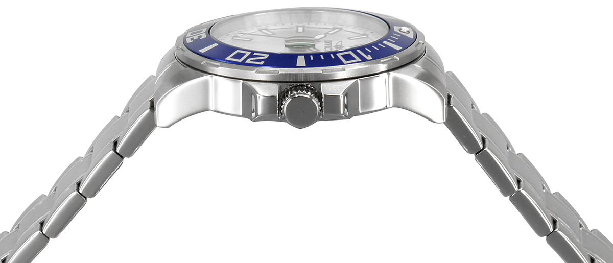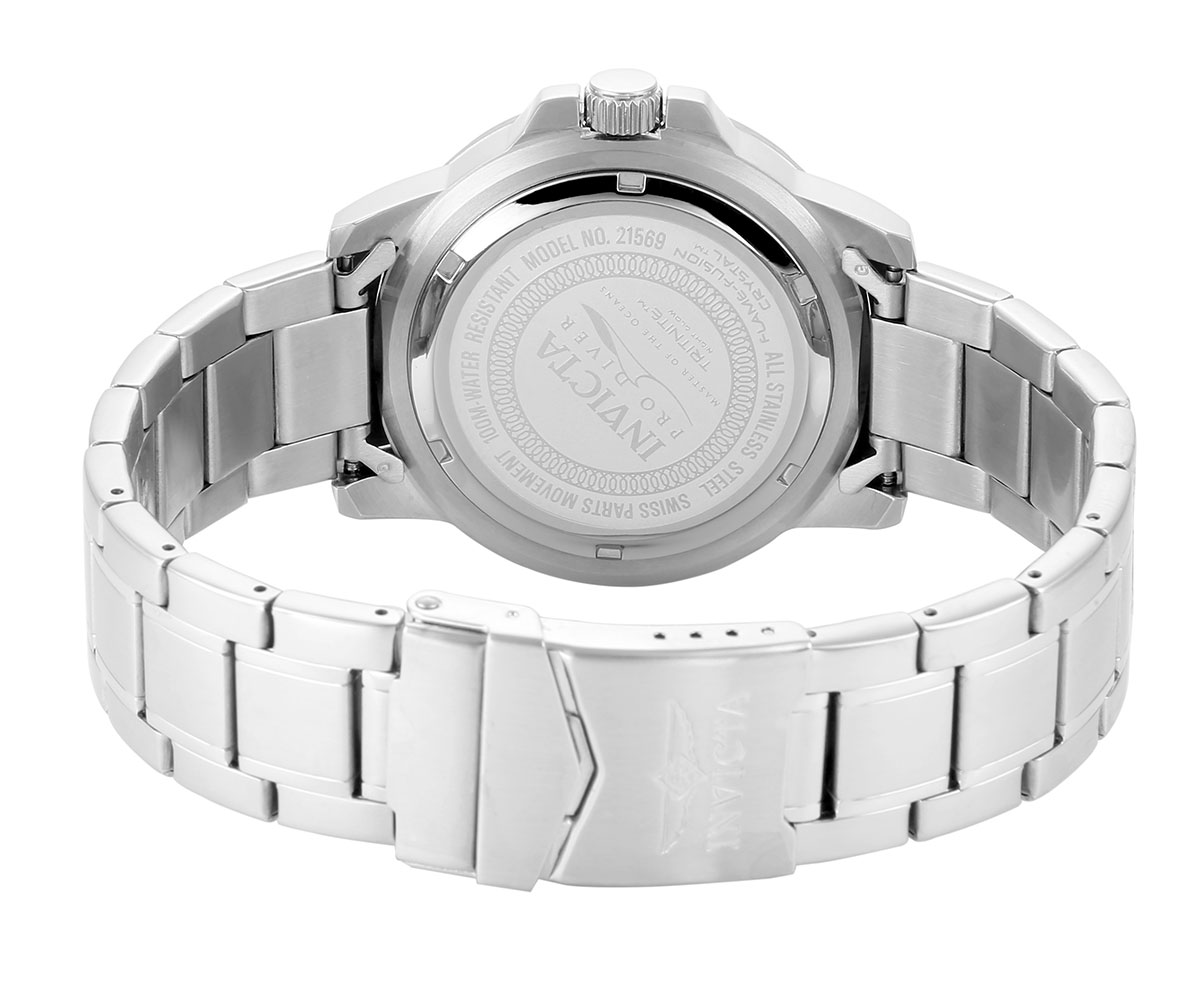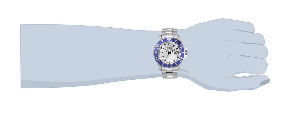 Sportovní nabídka značky Invicta , model Pro Diver 21569 . Velké pouzdro o průměru 45 mm bude dokonale vyhovovat masivním, mužným zápěstím. Jednosměrně otočná luneta v modré barvě ladí s číselníkem ve stříbrné barvě. Ručičky a indexy s černým okrajem kontrastují s číselníkem, díky čemuž jsou hodinky dobře čitelné. Sklo Flame Fusion odolné proti poškrábání s lupou na ukazateli data, hranatými okraji a pevným náramkem z nich dělají výrazné, robustní pánské hodinky.