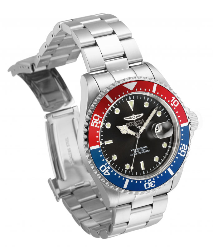 Pánské hodinky Invicta Pro Diver 23384 jsou hodinky prezentující kvintesenci sportovního stylu, síly a výkonu. Osloví především profesionální divere díky svému hlubokomořskému použití s třídou vodotěsnosti do 200 metrů. Je to perfektní společník pro ponoření do horizontu, ale i pro městské aktivity. Za svůj sportovní charakter vděčí designu kombinujícímu barvy červené, černé a modré, který si každý spojuje s rychlostí, extrémem a sportem. Toto silné složení také ztělesňuje skutečnou sílu hodinek, které tvoří pouzdro a náramek z nerezové oceli, šroubovací forma korunky a zadní části pouzdra a quartzový Machineek s precizní účinností.