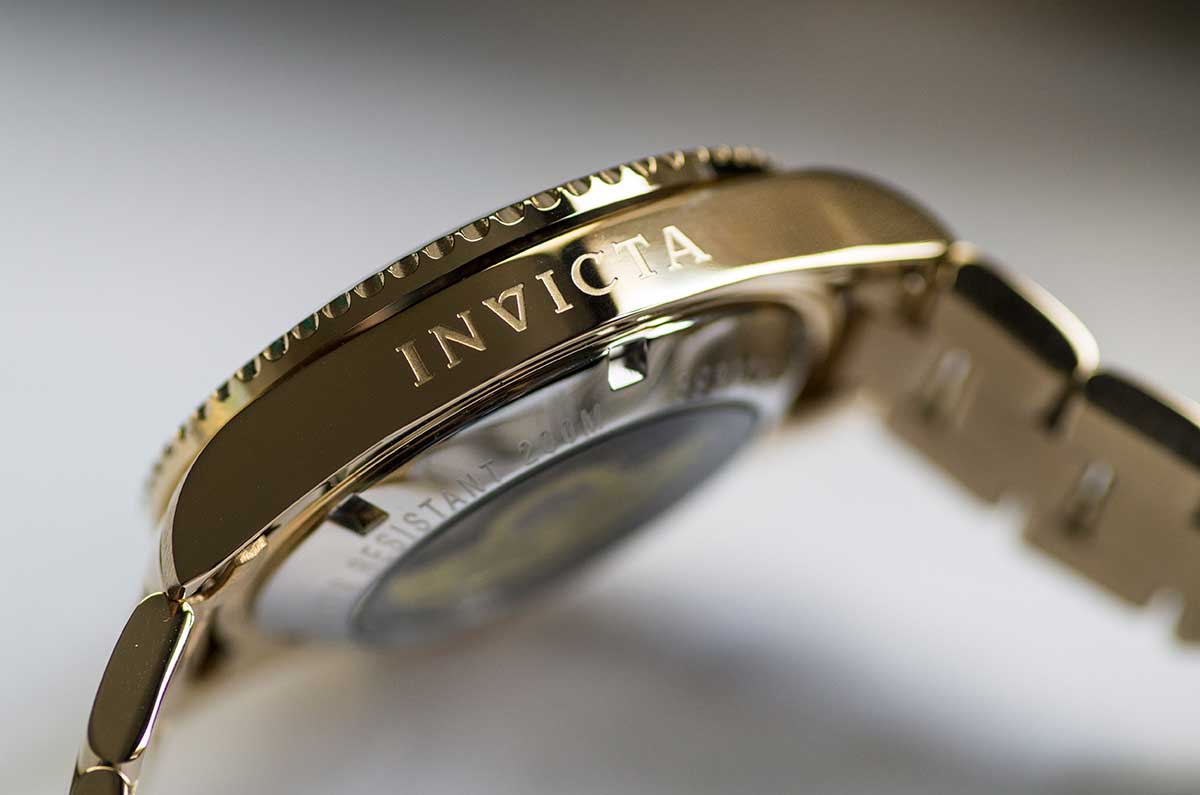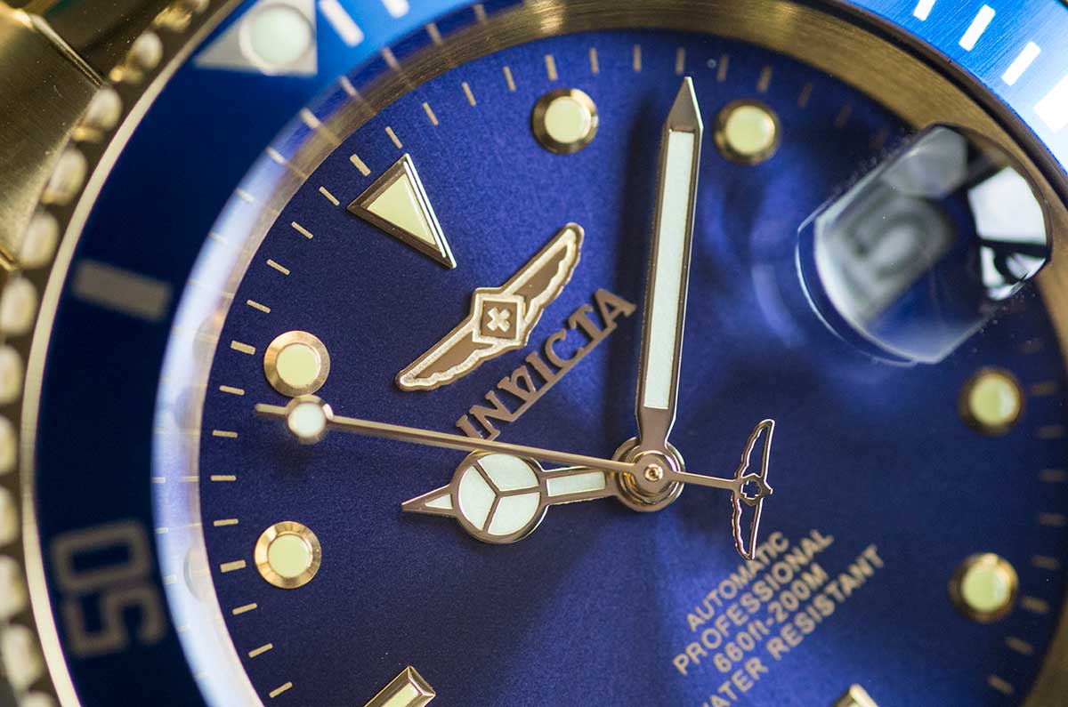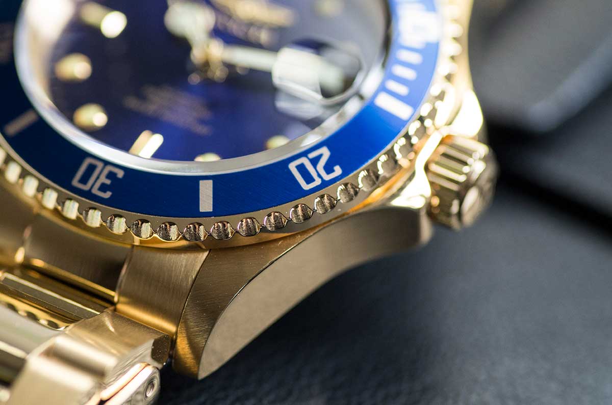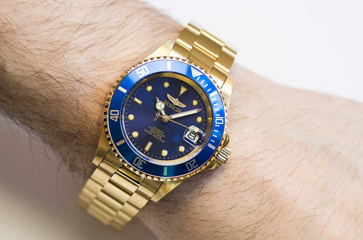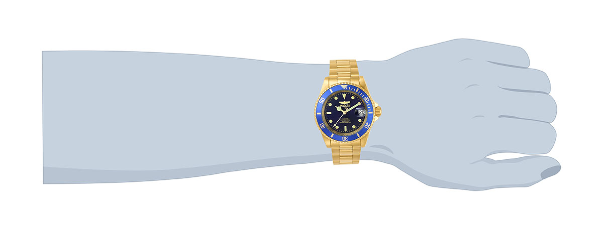 Invicta Pro Diver 8930OB v bohatých barvách. Pouzdro a náramek z nerezové oceli pozlacené žlutým zlatem s modrým ciferníkem a otočnou modrou diverskou lunetou. Díky průměru pouzdra 40 mm hodinky elegantně padnou na ruku a snadno se schovají pod manžetu košile. Konstrukce Invicta Pro Diver je utěsněna na 20 barů, takže se můžete bez problémů potápět s časovačem. Automatický Machineek od Sekio zajišťuje přesné měření času a je viditelný ze spodní části hodinek.