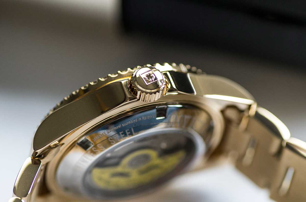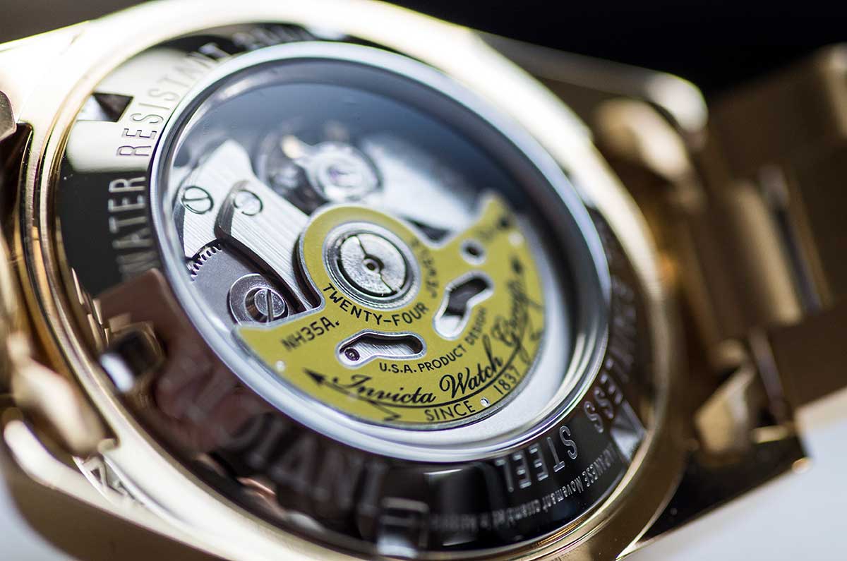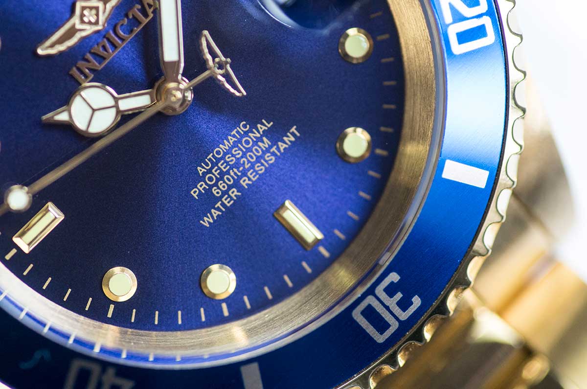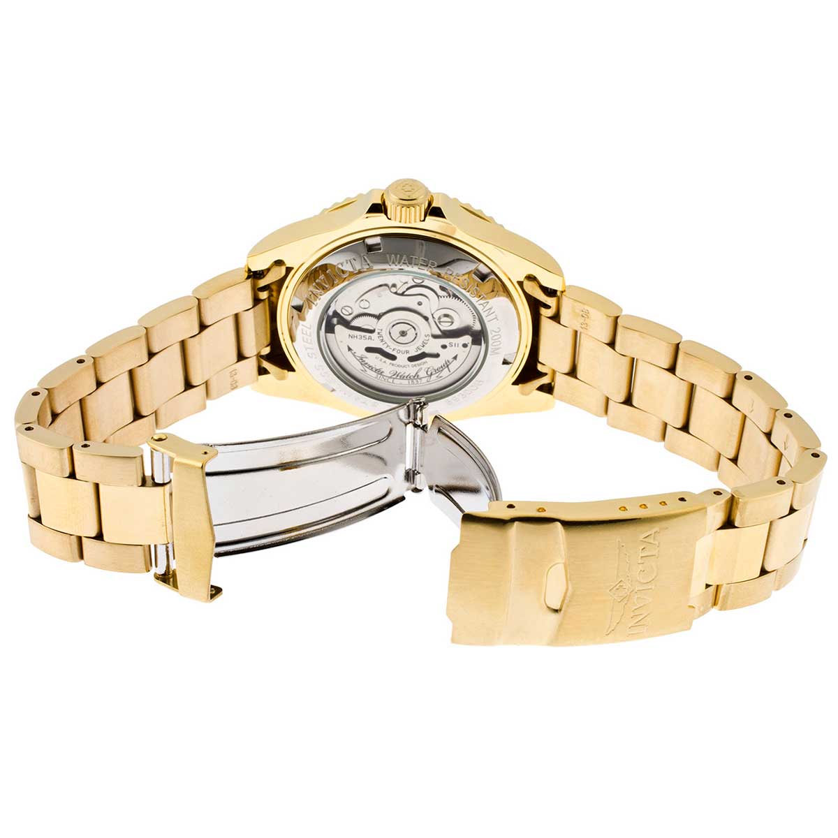 Invicta Pro Diver 8930OB v bohatých barvách. Pouzdro a náramek z nerezové oceli pozlacené žlutým zlatem s modrým ciferníkem a otočnou modrou diverskou lunetou. Díky průměru pouzdra 40 mm hodinky elegantně padnou na ruku a snadno se schovají pod manžetu košile. Konstrukce Invicta Pro Diver je utěsněna na 20 barů, takže se můžete bez problémů potápět s časovačem. Automatický Machineek od Sekio zajišťuje přesné měření času a je viditelný ze spodní části hodinek.
