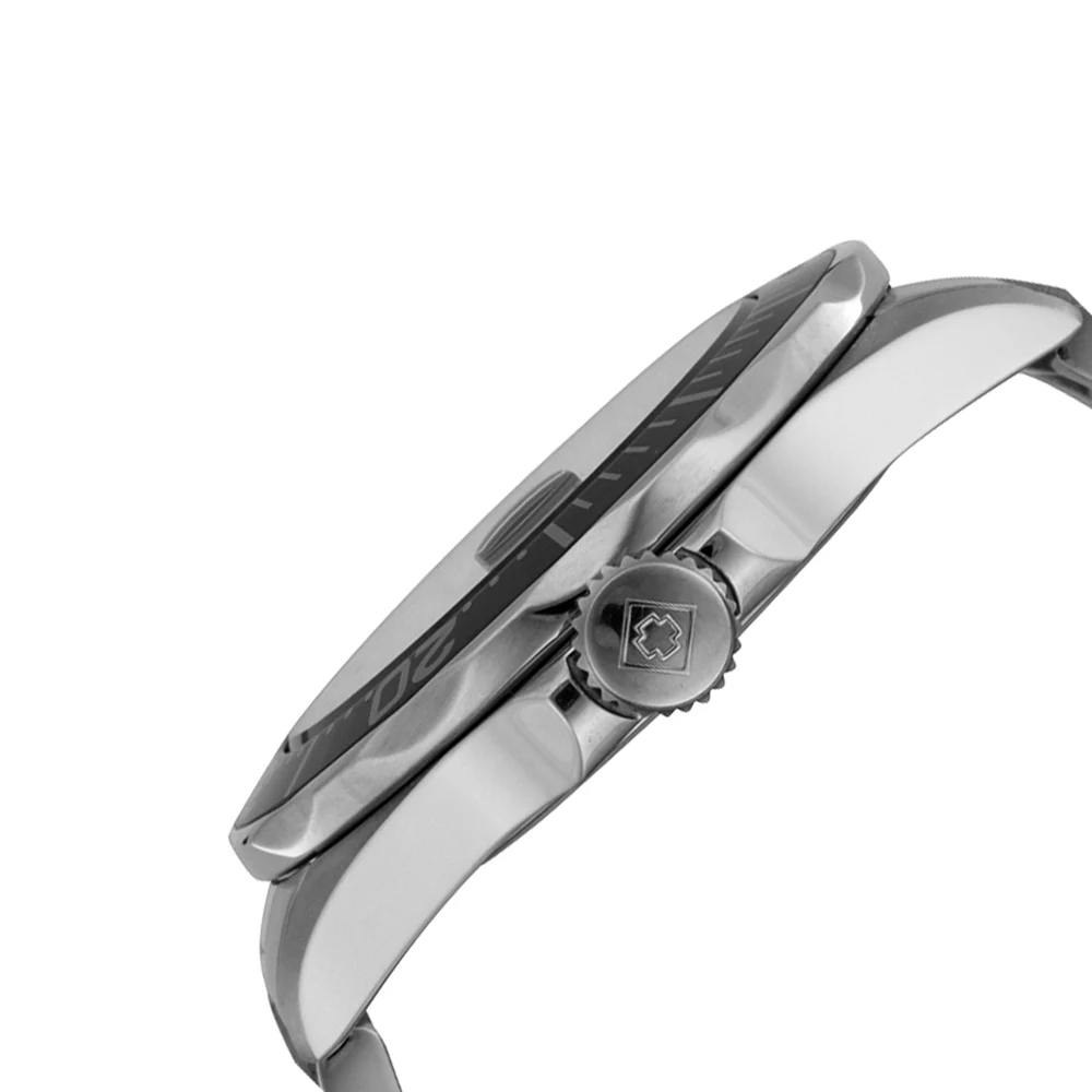 Pouzdro o průměru 40 mm a ocelový náramek tvoří odolnou kombinaci, která dobře sedí na většině zápěstí. Černá luneta podtrhuje sportovní charakter a minerální sklíčko chrání ciferník před poškrábáním. Uvnitř pracuje japonský quartzový strojek Seiko PC32 – přesný a bezúdržbový, ideální tam, kde záleží na spolehlivosti. Vodotěsnost 200 m umožňuje pohodlné plavání i rekreační potápění. Jednoduchý, přehledný ciferník s datem na třetí hodině (s lupou) a výraznými indexy zaručuje snadné čtení času za všech podmínek.
