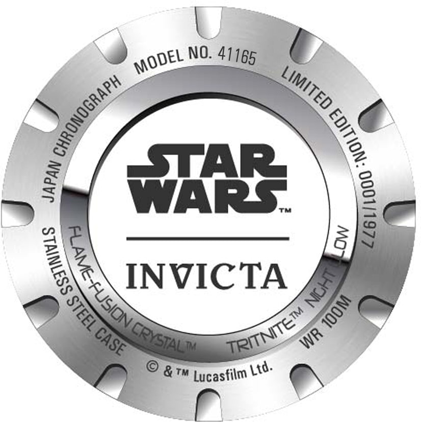Pánské hodinky Invicta Star Wars Darth Vader 41165 jsou nabídkou pro opravdové fanoušky ságy Star Wars a především Lorda Vadera. Limitované hodinky Invicta Star Wars Darth Vader byly vyrobeny v 1977 exemplářích, což z nich dělá hodnotný model pro sběratele - zadní část pouzdra hodinek zdobí rytina limitované edice a logo Star Wars.