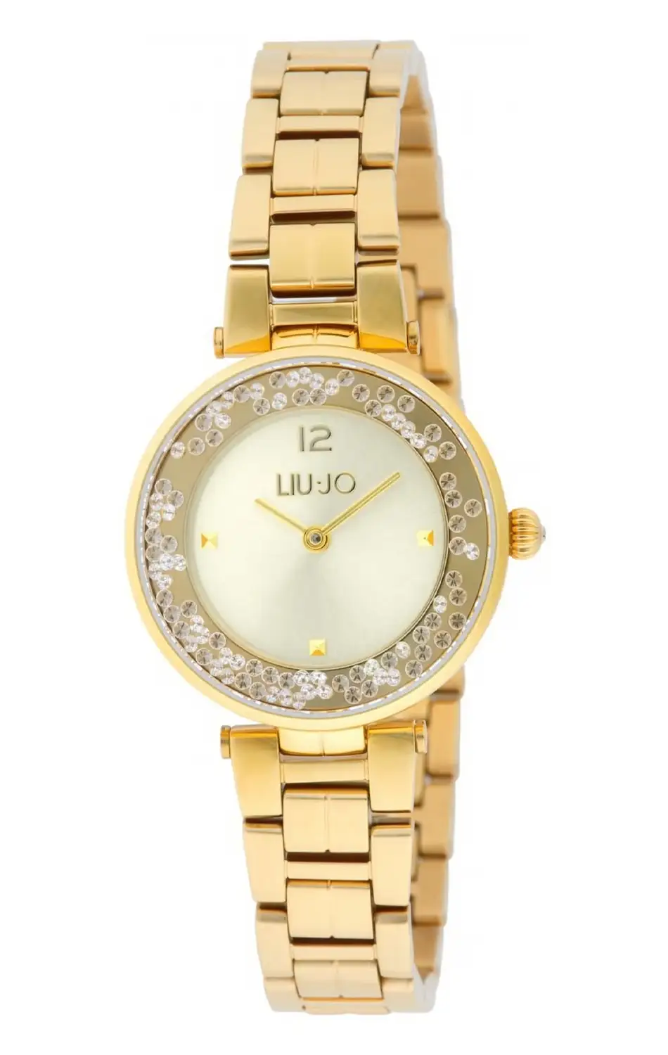 Pouzdro o průměru 29 mm je vyrobeno z oceli a pokryto povrchovou úpravou ve zlatém odstínu, která dodává hodinkám ženský, hřejivý charakter. Pouzdro zdobí jemně zasazené krystalky, jež podtrhují šperkový styl modelu a přitahují pozornost milovnic třpytivých akcentů. Celek doplňuje ocelový náramek, vizuálně jemný a pohodlný při každodenním nošení. Žlutý ciferník chráněný minerálním sklem si zachovává dobrou čitelnost a minimalistická kompozice zajišťuje, že hodinky Liu Jo Dancing Solene zůstávají univerzálním a elegantním doplňkem pro každý den.