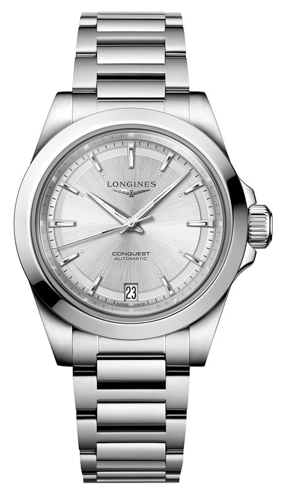 Číselník byl broušený s efektem slunečního paprsku, který se třpytí při sebemenší změně úhlu polohy. Dámské hodinky Longines Conquest 2023 mají na číselníku aplikované indexy a ručičky vykládané švýcarským Super-LumiNova® (svítivý materiál). Přesné a efektivní odečítání minut usnadňuje čárkovaná stupnice orientovaná na okraji disku. Pragmatické je i minimalistické zobrazení data na 6. hodině, vysokou vnímanou hodnotu zajišťuje logo Longines s okřídlenými přesýpacími hodinami, názvem kolekce a podpisem švýcarské kvality.