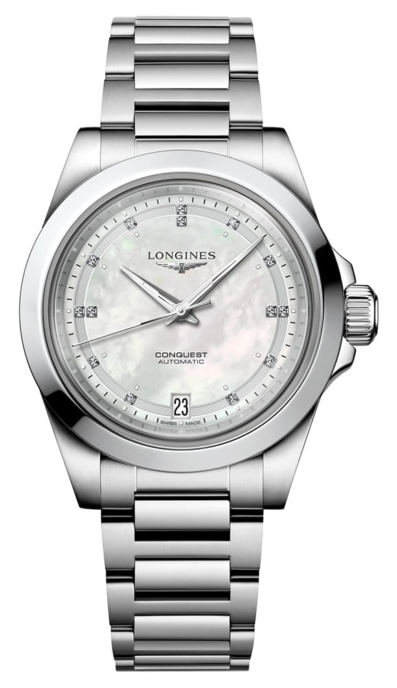 Ciferník je vyroben z přírodní perleti, která se smyslně třpytí. Poskytuje také rafinovaný podklad pro 14 diamantů Top Wesselton o celkové váze 0,035 karátu. Dámské hodinky Longines Conquest 2023 s diamanty a perletí navíc obsahují ručičky vykládané švýcarským Super-LumiNova® (svítící materiál) na ciferníku. Přesné a efektivní odečítání minut usnadňuje čárkovaná stupnice orientovaná na okraji disku. Pragmatické je i minimalistické zobrazení data na 6. hodině, vysokou vnímanou hodnotu zajišťuje logo Longines s okřídlenými přesýpacími hodinami, názvem kolekce a podpisem švýcarské kvality.