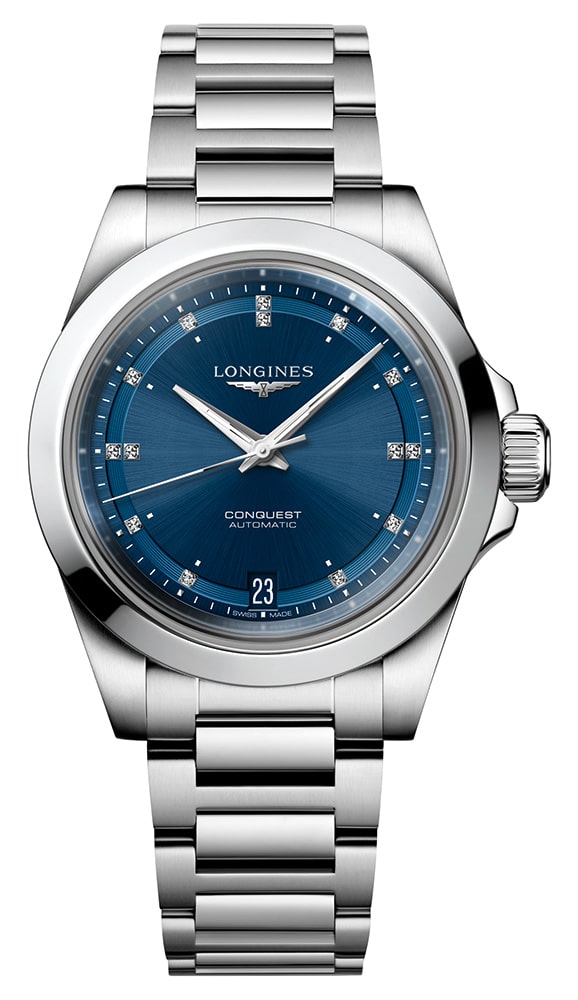 Číselník byl broušený s efektem slunečního paprsku, který se třpytí při sebemenší změně úhlu polohy. Poskytuje také rafinovaný podklad pro 14 diamantů Top Wesselton o celkové váze 0,035 karátu. Dámské hodinky Longines Conquest 2023 s diamanty navíc obsahují ručičky vykládané švýcarským Super-LumiNova® (svítící materiál) na ciferníku. Přesné a efektivní odečítání minut usnadňuje čárkovaná stupnice orientovaná na okraji disku. Pragmatické je i minimalistické zobrazení data na 6. hodině, vysokou vnímanou hodnotu zajišťuje logo Longines s okřídlenými přesýpacími hodinami, názvem kolekce a podpisem švýcarské kvality.