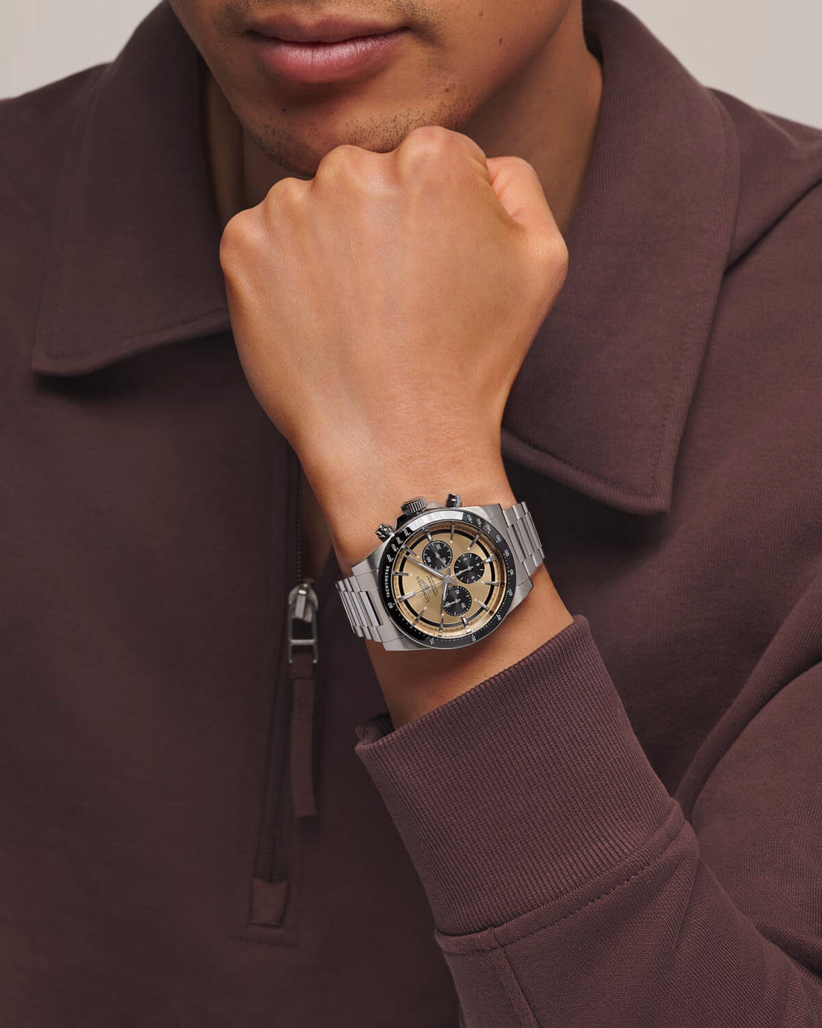 Pod safírovým sklíčkem, které je extrémně odolné proti poškrábání, se nachází hnědý číselník . Sklo má na obou stranách antireflexní vrstvu, která zvýší čitelnost ciferníku. Výrobce vybavil hodinky funkcí chronografu, jinak také stopky. Chronograf vám pomůže změřit přesný čas například kola v závodě. Nechyběla ani tachymetrická stupnice, která byla umístěna na lunetě pouzdra. Tachymetr bude ukazovat průměrnou rychlost pohybu na vzdálenost jednoho kilometru. Čas lze číst díky leštěným indexům a ručkám ve stříbrné barvě. Použitý svítící povrch Super-LumiNova vám pomůže číst čas i v naprosté tmě. Ciferník byl navržen tak, aby z něj každý majitel mrknutím oka mohl přečíst aktuální čas a den v měsíci. Pod číselníkem je automatický Machineek vyvinutý speciálně pro Longines, kalibr L898. Longines L898 má rezervu chodu až 59 hodin, což vám umožní odpočinout si od používání hodinek, aniž byste se museli bát, že se zastaví. Mechanismus je vybaven silikonovou antimagnetickou vyvažovací pružinou, díky které je mechanismus odolný vůči magnetickému poli a vyšším teplotám.