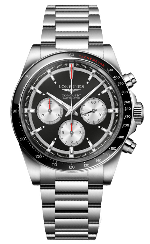 Pod extrémně odolným safírovým sklíčkem se nachází černý ciferník . Sklo má na obou stranách antireflexní vrstvu, která zvýší čitelnost ciferníku. Výrobce vybavil hodinky funkcí chronografu, jinak také stopky. Chronograf vám pomůže změřit přesný čas například kola v závodě. Nechyběla ani tachymetrická stupnice, která byla umístěna na lunetě pouzdra. Tachymetr bude ukazovat průměrnou rychlost pohybu na vzdálenost jednoho kilometru. Čas lze číst díky leštěným indexům a ručkám ve stříbrné barvě. Použitý svítící povrch Super-LumiNova vám pomůže číst čas i v naprosté tmě. Ciferník byl navržen tak, aby z něj každý majitel mrknutím oka mohl přečíst aktuální čas a den v měsíci. Pod číselníkem je automatický Machineek vyvinutý speciálně pro Longines, kalibr L898. Longines L898 má rezervu chodu až 59 hodin, což vám umožní odpočinout si od používání hodinek, aniž byste se museli bát, že se zastaví. Mechanismus je vybaven silikonovou antimagnetickou vyvažovací pružinou, díky které je mechanismus odolný vůči magnetickému poli a vyšším teplotám.