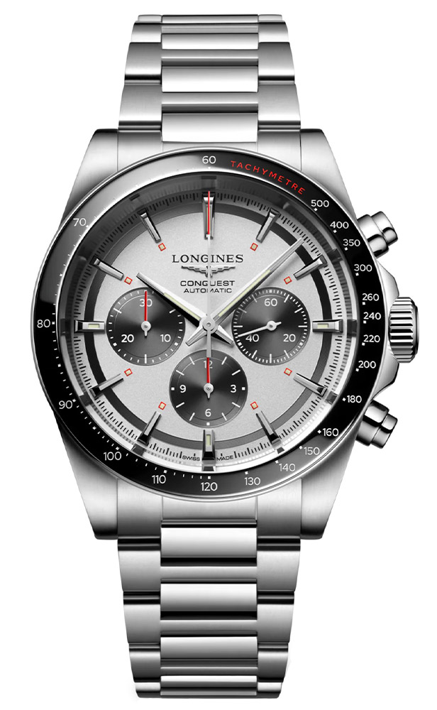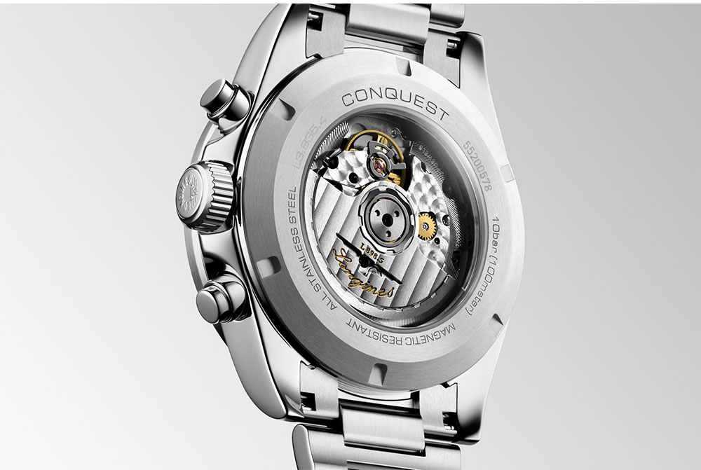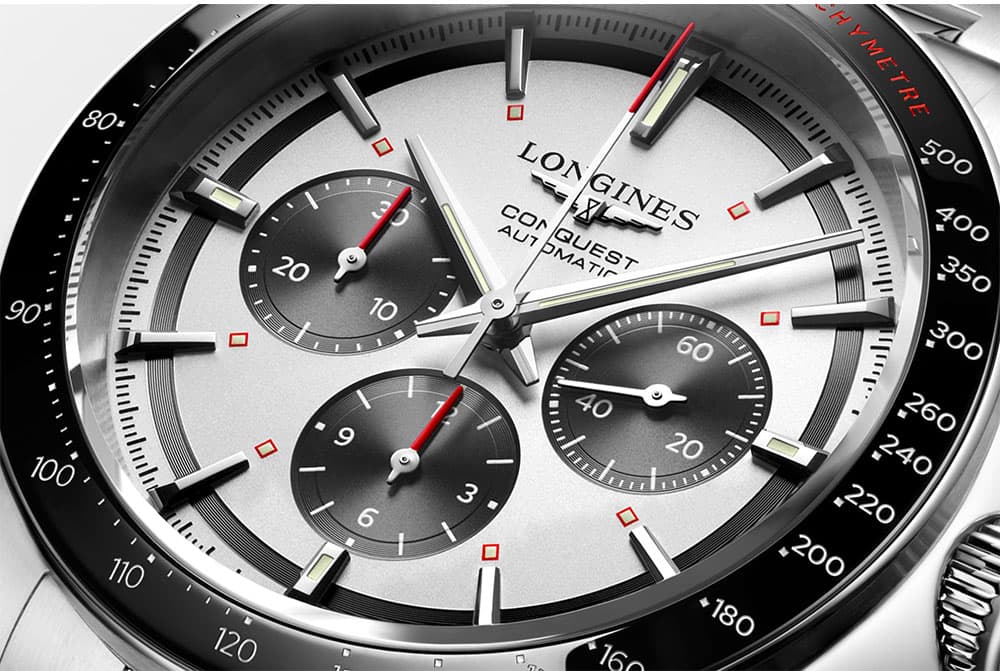 Pod safírovým sklíčkem, které je extrémně odolné proti poškrábání, se nachází stříbrný ciferník . Sklo má na obou stranách antireflexní vrstvu, která zvýší čitelnost ciferníku. Výrobce vybavil hodinky funkcí chronografu, jinak také stopky. Chronograf vám pomůže změřit přesný čas například kola v závodě. Nechyběla ani tachymetrická stupnice, která byla umístěna na lunetě pouzdra. Tachymetr bude ukazovat průměrnou rychlost pohybu na vzdálenost jednoho kilometru. Čas lze číst díky leštěným indexům a ručkám ve stříbrné barvě. Použitý svítící povrch Super-LumiNova vám pomůže číst čas i v naprosté tmě. Ciferník byl navržen tak, aby z něj každý majitel mrknutím oka mohl přečíst aktuální čas a den v měsíci. Pod číselníkem je automatický Machineek vyvinutý speciálně pro Longines, kalibr L898. Longines L898 má rezervu chodu až 59 hodin, což vám umožní odpočinout si od používání hodinek, aniž byste se museli bát, že se zastaví. Mechanismus je vybaven silikonovou antimagnetickou vyvažovací pružinou, díky které je mechanismus odolný vůči magnetickému poli a vyšším teplotám.