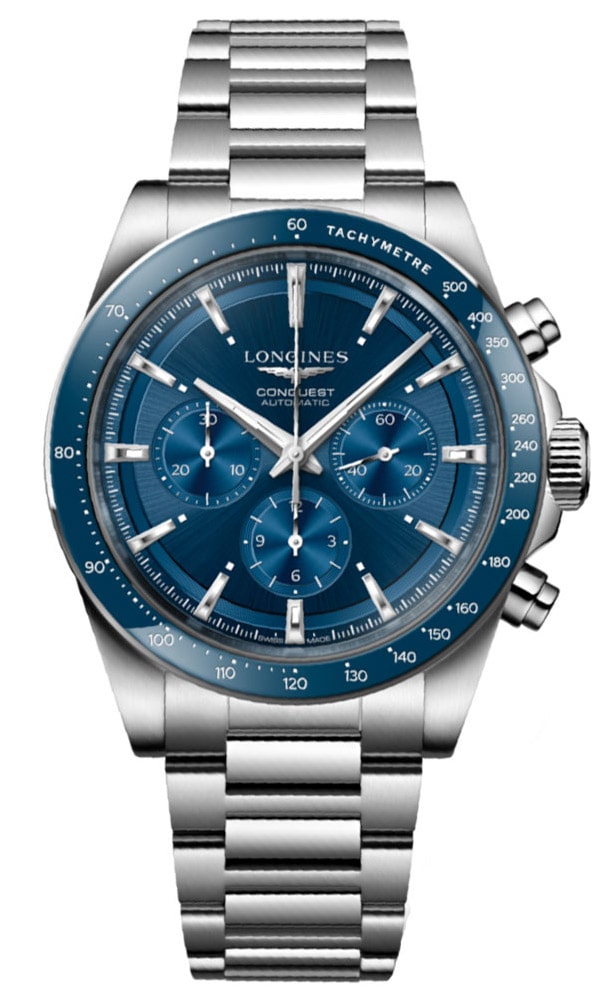 Pod extrémně odolným safírovým sklíčkem se nachází modrý číselník . Sklo má na obou stranách antireflexní vrstvu, která zvýší čitelnost ciferníku. Výrobce vybavil hodinky funkcí chronografu, jinak také stopky. Chronograf vám pomůže změřit přesný čas například kola v závodě. Nechyběla ani tachymetrická stupnice, která byla umístěna na lunetě pouzdra. Tachymetr bude ukazovat průměrnou rychlost pohybu na vzdálenost jednoho kilometru. Čas lze číst díky leštěným indexům a ručkám ve stříbrné barvě. Použitý svítící povrch Super-LumiNova vám pomůže číst čas i v naprosté tmě. Ciferník byl navržen tak, aby z něj každý majitel mrknutím oka mohl přečíst aktuální čas a den v měsíci. Pod číselníkem je automatický Machineek vyvinutý speciálně pro Longines, kalibr L898. Longines L898 má rezervu chodu až 59 hodin, což vám umožní odpočinout si od používání hodinek, aniž byste se museli bát, že se zastaví. Mechanismus je vybaven silikonovou antimagnetickou vyvažovací pružinou, díky které je mechanismus odolný vůči magnetickému poli a vyšším teplotám.