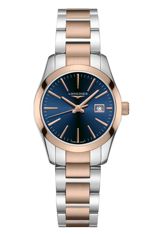 Dámské hodinky Longines Conquest Classic Lady L2.286.3.92.7 představují kvintesenci sportovní elegance. V souladu s hodnotami značky, kterými jsou elegance, tradice a výkon, byly vytvořeny dámské hodinky, které tyto vlastnosti zahrnují. Kulaté pouzdro o průměru 29,50 mm s PVD růžově pozlacenými prvky, které najdeme i na elegantním náramku. Design hodinek se ideálně hodí ke každodennímu, sportovnímu i elegantnímu outfitu. Longines Conquest Classic jsou univerzální dámské hodinky pro všechny příležitosti. Sklo odolné proti poškrábání chrání modrý ciferník s pozlacenými indexy a ručičkami, což zvyšuje čitelnost. Přesný čas měří quartzový Machineek, napájený baterií s funkcí EOL . Když se baterie vybije, sekundová ručička poskočí každé 4 sekundy, aby naznačila, že je čas ji vyměnit. Nechte baterii vyměnit pouze v autorizovaném servisu Longines - Doliński Watch Service.