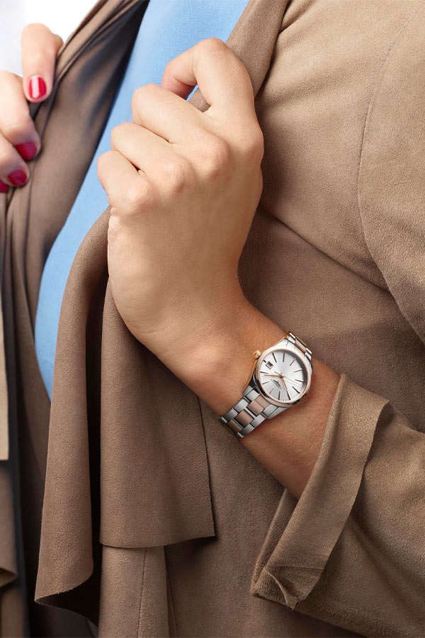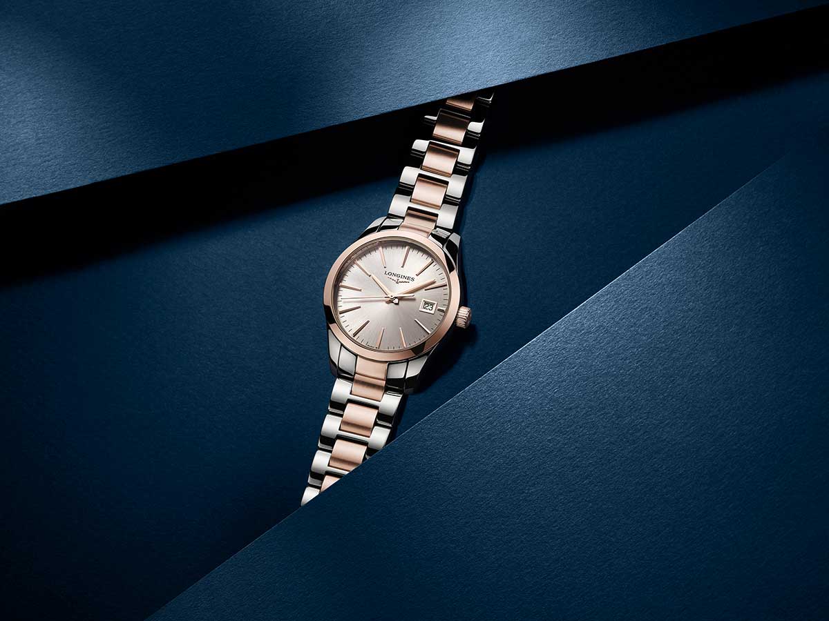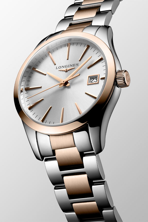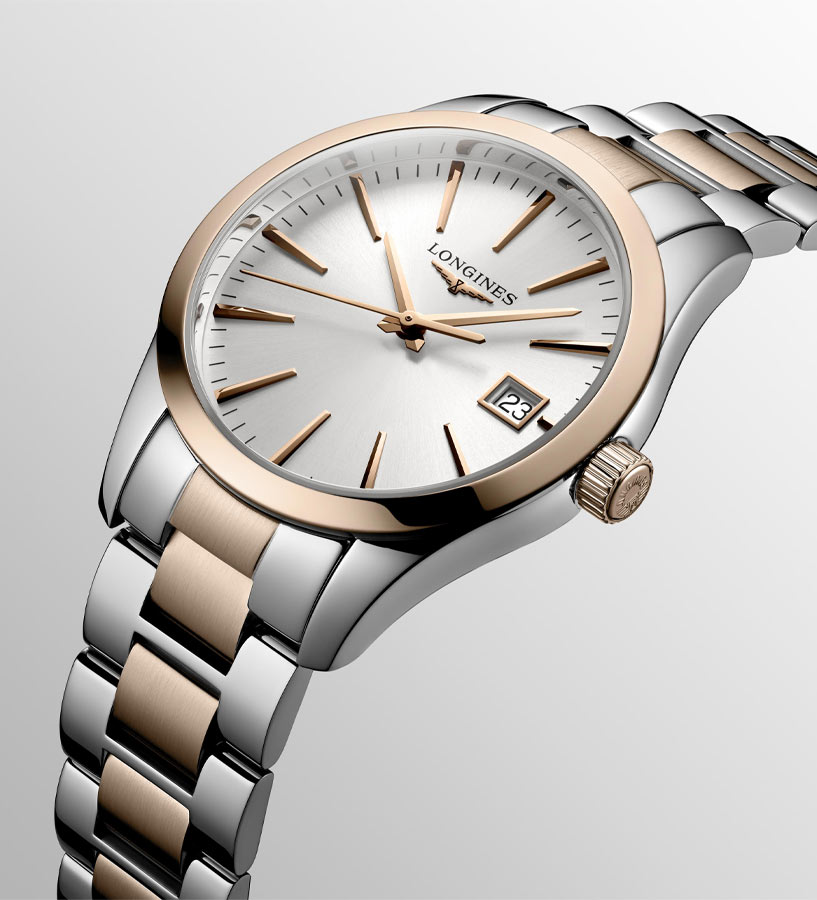 Dámské hodinky Longines Conquest Classic Lady L2.386.3.72.7 představují kvintesenci sportovní elegance. V souladu s hodnotami značky, kterými jsou elegance, tradice a výkon, byly vytvořeny dámské hodinky, které tyto vlastnosti zahrnují. Kulaté pouzdro o průměru 34mm s PVD růžově pozlacenými prvky, které najdeme i na elegantním náramku. Design hodinek se ideálně hodí ke každodennímu, sportovnímu i elegantnímu outfitu. Longines Conquest Classic jsou všestranné hodinky pro každou příležitost. Sklo odolné proti poškrábání s antireflexem chrání ciferník stříbrné barvy s pozlacenými indexy a ručičkami a dodává čitelnost. Přesný čas měří quartzový Machineek, napájený baterií s funkcí EOL . Když se baterie vybije, sekundová ručička poskočí každé 4 sekundy, aby naznačila, že je čas ji vyměnit. Nechte baterii vyměnit pouze v autorizovaném servisu Longines - Doliński Watch Service.