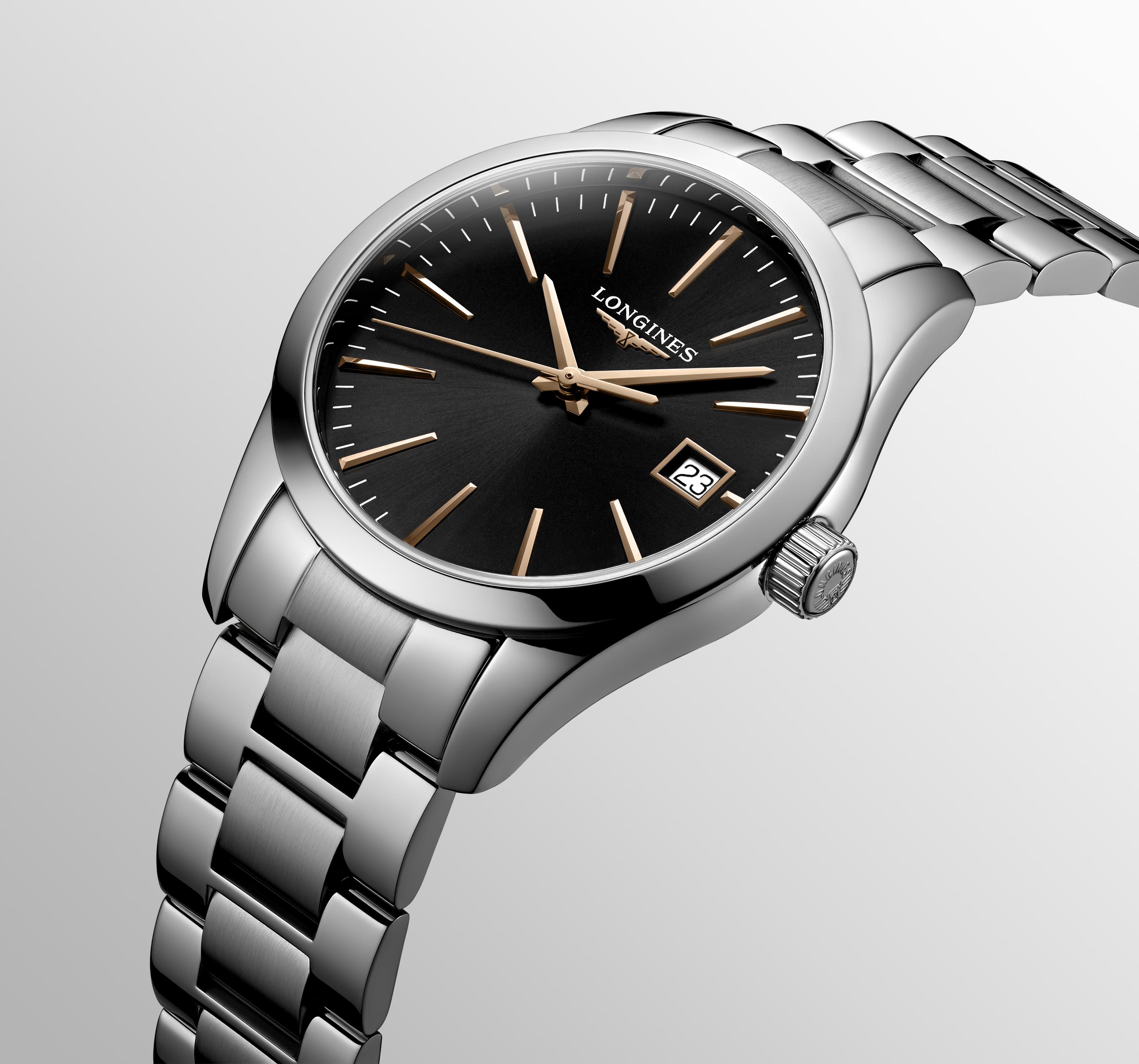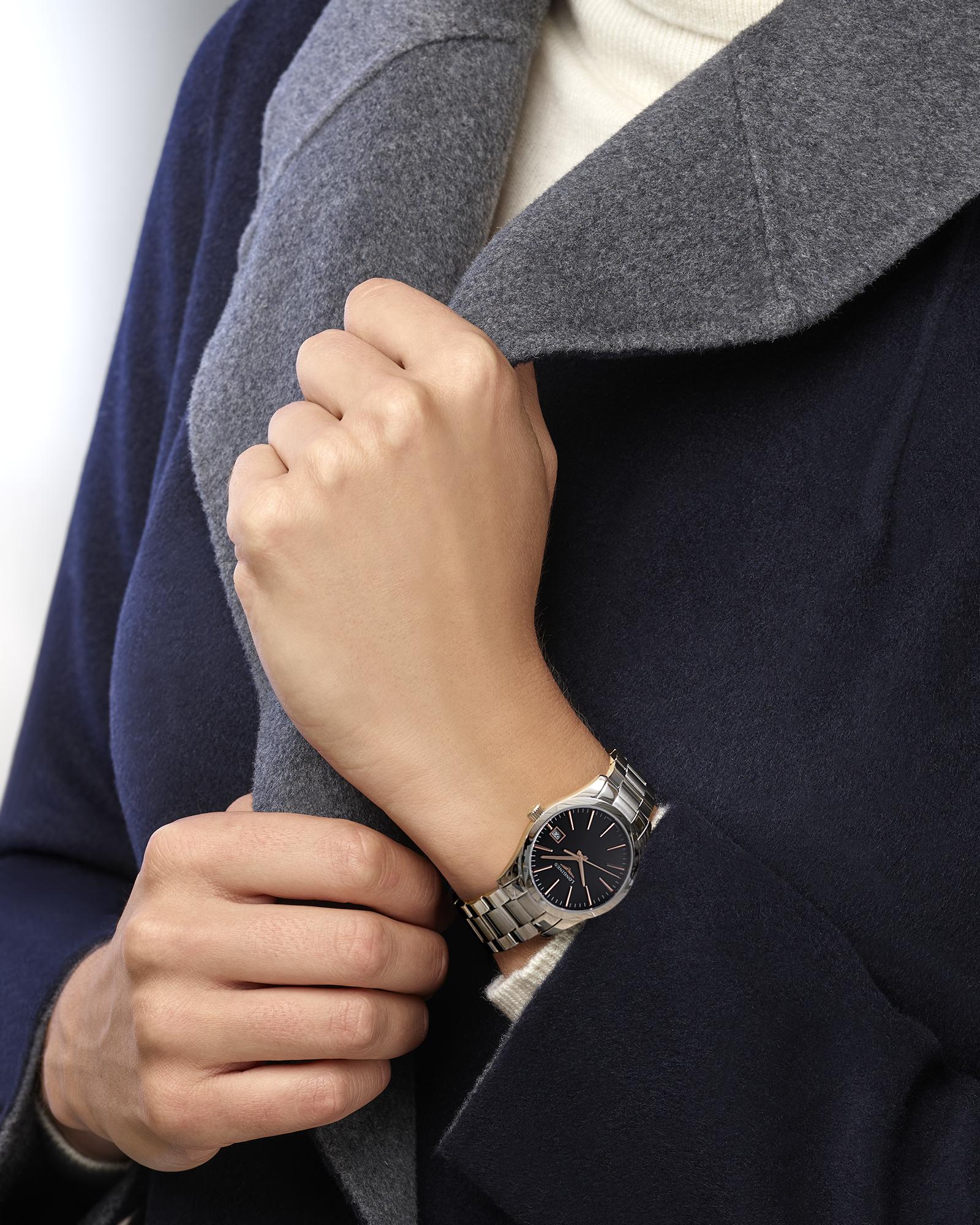 Dámské hodinky Longines Conquest Classic Lady L2.386.4.52.6 představují kvintesenci sportovní elegance. V souladu s hodnotami značky, kterými jsou elegance, tradice a výkon, byly vytvořeny dámské hodinky, které tyto vlastnosti zahrnují. 34mm leštěné kulaté pouzdro s vysokým leskem se vyznačuje tenkými a elegantními očky pouzdra, které drží náramek s matnými detaily uprostřed a leštěnými okraji. Design hodinek se ideálně hodí ke každodennímu, sportovnímu i elegantnímu outfitu. Longines Conquest Classic jsou všestranné hodinky pro každou příležitost. Antireflexní sklo odolné proti poškrábání chrání černý ciferník s pozlacenými indexy a ručičkami a dodává čitelnost. Přesný čas měří quartzový Machineek, napájený baterií s funkcí EOL . Když je baterie vybitá, sekundová ručička každé 4 sekundy poskočí, abyste věděli, že je čas ji vyměnit. Nechte baterii vyměnit pouze v autorizovaném servisu Longines - Doliński Watch Service.