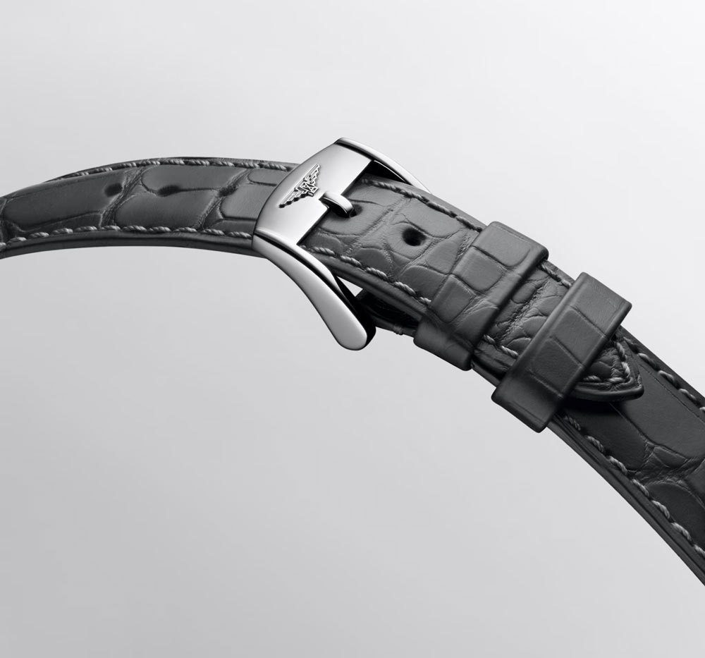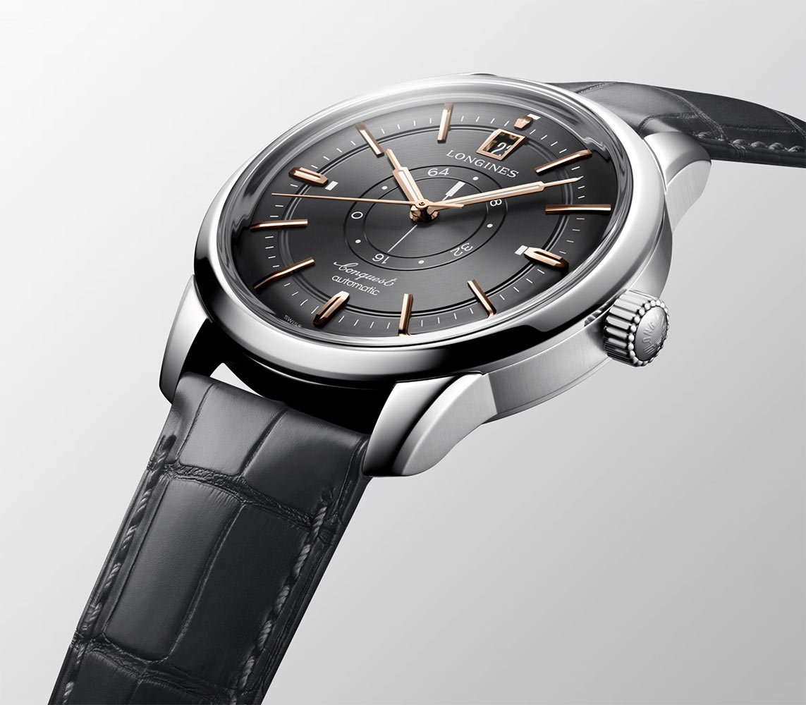 Nejdůležitějším prvkem nového modelu Longines L16484622 je centrální stupnice rezervy chodu, jejíž přítomnost zdobí antracitový číselník. Použití dvou rotujících kotoučů, vnějšího se stupnicí od 0 do 72 a vnitřního jako ukazovátka, vytváří dynamickou kinetickou podívanou. Toto zpočátku neobvyklé řešení si postupně získává uznání a zapadá do ucelené estetiky hodinek. Kromě centrální rezervy chodu ciferník zdobí precizně provedené hodinové indexy, minutová stupnice a neobvykle umístěné datumové okénko nahoře na 12. hod. Klasické detaily jako název značky, název kolekce a informace o typu vinutí mechanismu vytvářejí harmonickou kompozici. Aktuální čas ukazují elegantní ručičky. Jemné detaily, jako je svítící Super-LumiNova® Swiss Made na pozlacených ručičkách, dodávají hodinkám sofistikovanost a zdůrazňují charakter hodinek.