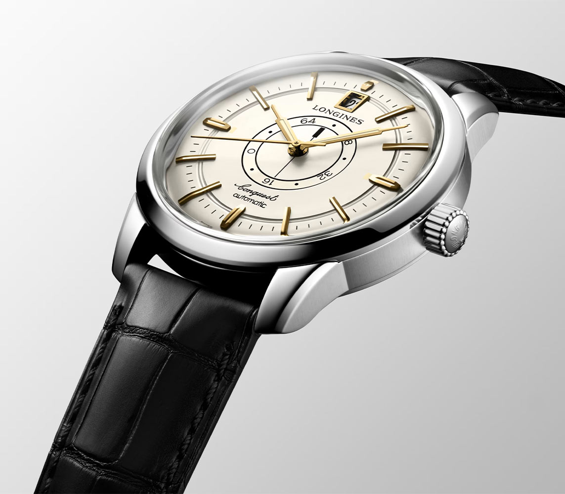 Nejdůležitějším prvkem nového modelu Longines L16484782 je centrální stupnice rezervy chodu, jejíž přítomnost zdobí číselník šampaňského. Použití dvou rotujících kotoučů, vnějšího se stupnicí od 0 do 72 a vnitřního jako ukazovátka, vytváří dynamickou kinetickou podívanou. Toto zpočátku neobvyklé řešení si postupně získává uznání a zapadá do ucelené estetiky hodinek. Kromě centrální rezervy chodu zdobí ciferník precizně provedené hodinové indexy, minutová stupnice a neobvykle umístěné datumové okénko nahoře na 12. hod. Klasické detaily jako název značky, název kolekce a informace o typu vinutí mechanismu vytvářejí harmonickou kompozici. Aktuální čas ukazují elegantní ručičky. Jemné detaily, jako je svítící Super-LumiNova® Swiss Made na pozlacených ručičkách, dodávají hodinkám sofistikovanost a zdůrazňují charakter hodinek.