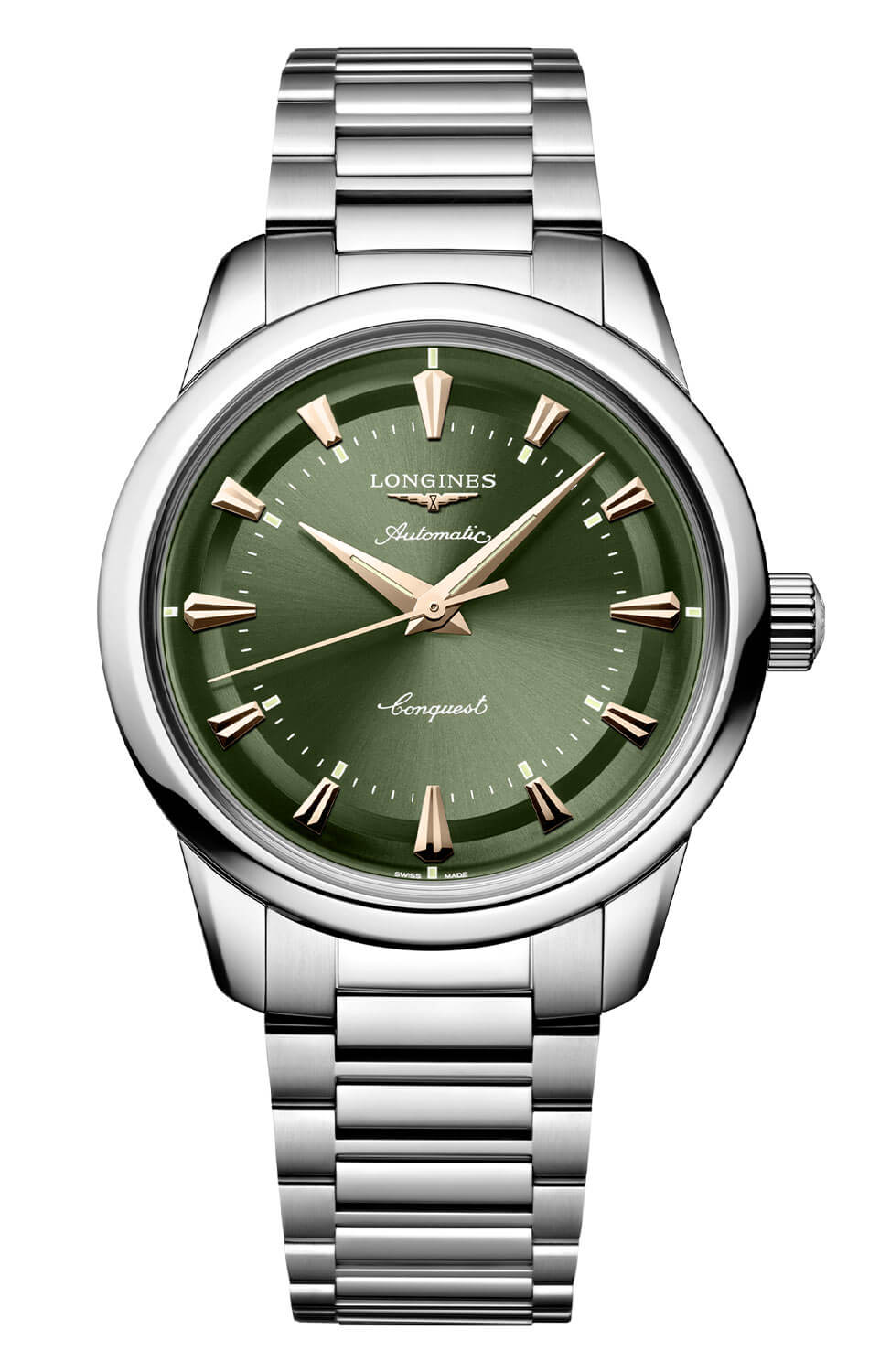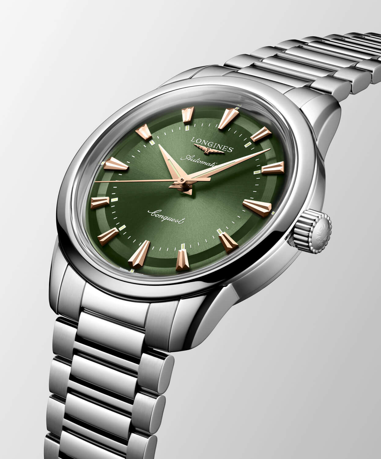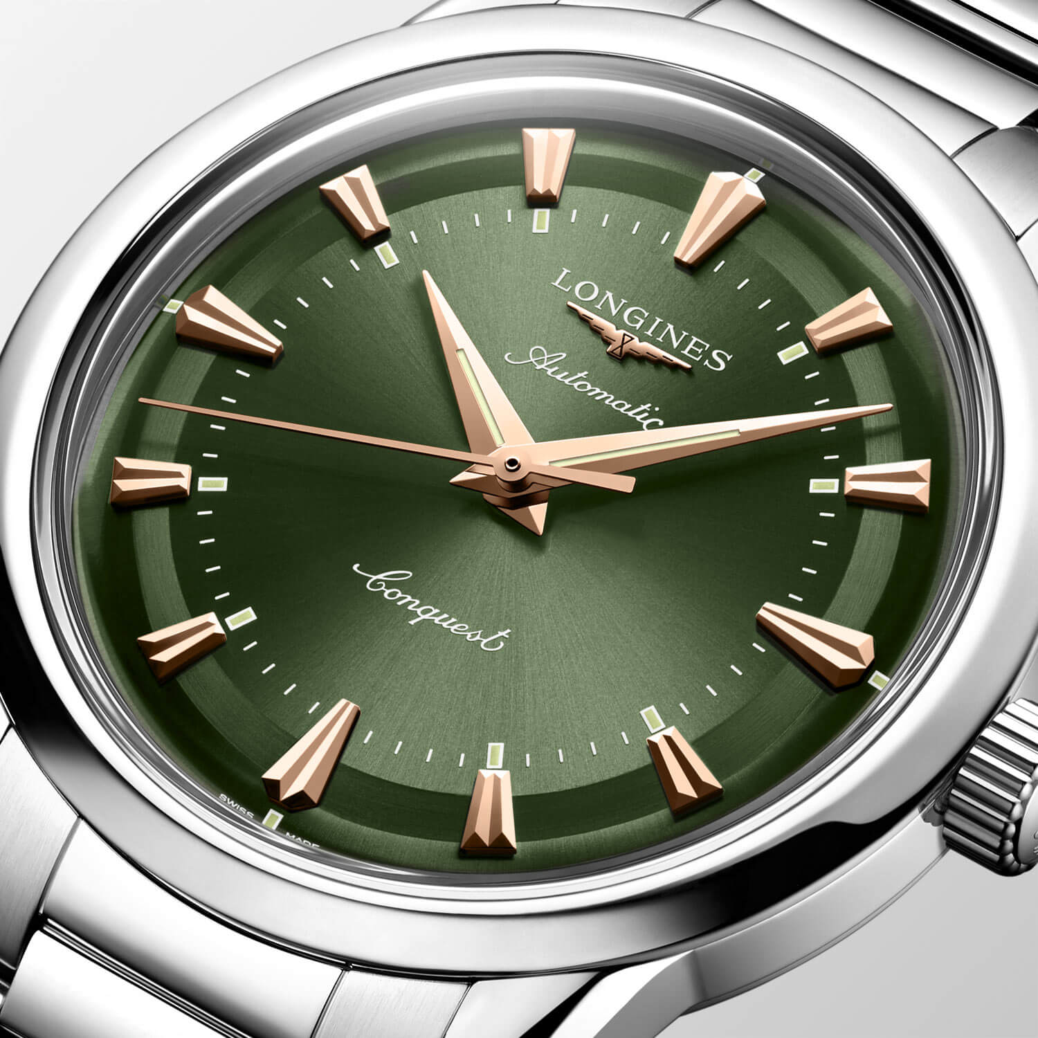Zelený ciferník s efektem sunburst vyzařuje klid a distingvovanost. Pozlacené ručky typu dauphine a aplikované indexy ve tvaru kuželů jsou pokryty růžově zlatou vrstvou a vytvářejí ušlechtilý kontrast s podkladem. Charakteristické logo okřídlených přesýpacích hodin a jemné rozmístění prvků věrně odkazují na archivní návrhy značky. Pod povrchem ciferníku pracuje strojek Longines L888 – švýcarský automatický kalibr se 72hodinovou rezervou chodu a antimagnetickou vlásenkovou pružinou, která zajišťuje stabilitu chodu v běžném provozu. Longines Automatic L1.649.4.02.6 na náramku je víc než jen hodinky – je to konzistentní příběh o tradici, stylu a spolehlivé přesnosti.