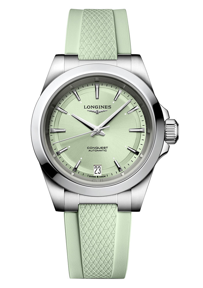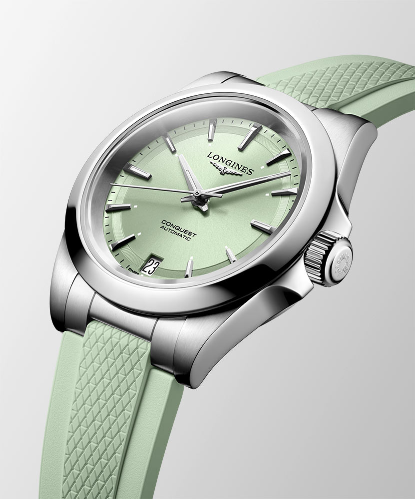 K příležitosti jubilea 70. výročí premiéry řady Conquest byla tato linie obohacena o nové verze, které spojují sportovní eleganci, nadčasový design a pokročilá řešení ideální pro každodenní nošení. Jedním z nich je dámské hodinky Longines Conquest L3.430.4.02.9, které se vyznačují elegantní zelenou ciferníkem s šnekovým broušením. Tyto hodinky mají jedenáct aplikovaných, rhodiově povrchově upravených indexů hodin a datové okénko v 6 hodinách. Indexy hodin jsou také rhodiově povrchově upravené a ručičky hodin a minut jsou rhodiově povrchově upravené a leštěné s pokrytím Super-LumiNova®, což zajišťuje optimální čitelnost v jakoukoli denní dobu. Bezchybné čtení podporuje odolné proti poškrábání safírové sklo s vícevrstvou antireflexní úpravou na obou stranách.