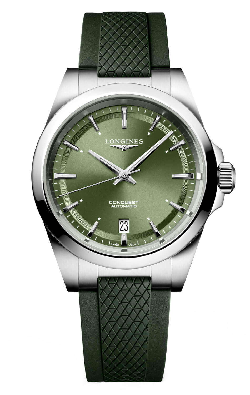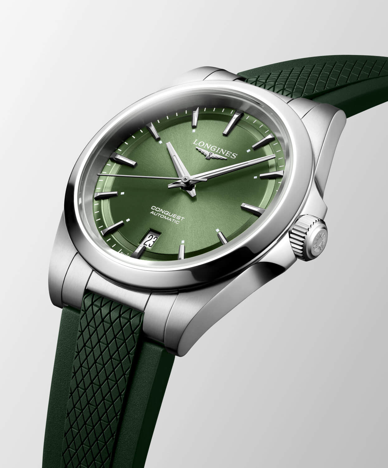 Longines Conquest L3.720.4.02.9 je hodinky navržené s ohledem na ty, kteří očekávají nejvyšší kvalitu, spolehlivost a eleganci v moderním provedení. Tento model o průměru 38 mm dokonale kombinuje sportovní charakter s vytříbeným designem, což z něj činí ideální doplněk pro každou příležitost. Zelený ciferník se saténovou úpravou přitahuje pozornost hloubkou barvy a precizním zpracováním. Stříbrné indexy a ručky, pokryté luminiscenční vrstvou Super-LumiNova®, vytvářejí výrazný kontrast, který zajišťuje vynikající čitelnost za všech světelných podmínek. Na šesté hodině se nachází diskrétní okénko datového ukazatele, které obohacuje funkčnost hodinek, aniž by narušovalo jejich harmonický design.
