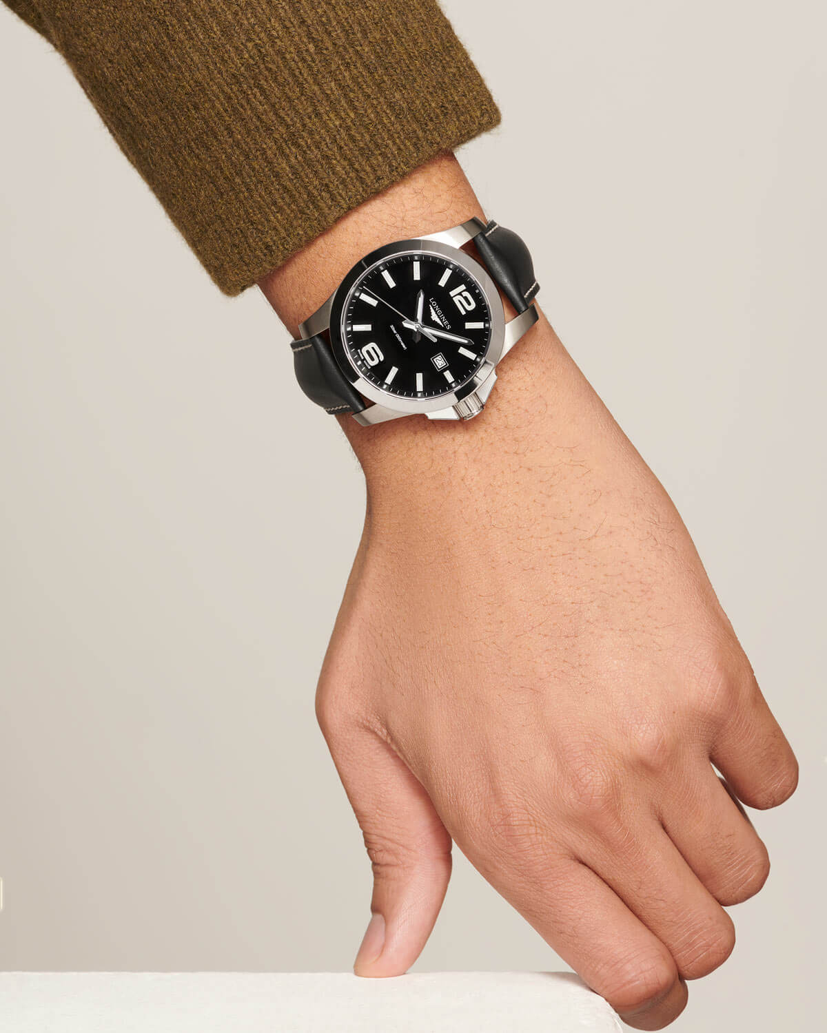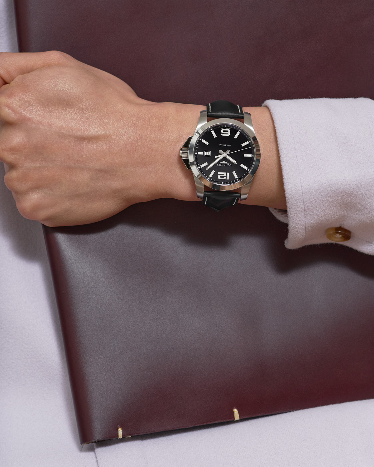 Pánské hodinky Longines Conquest L3.760.4.56.3 jsou ztělesněním sportovní elegance. Zvláštní pozornost přitahuje sportovní 43mm pouzdro vyrobené z nerezové oceli. Šroubovací zadní část pouzdra a korunka utěsňují hodinky až do 30 barů, což jim umožňuje jít i pod vodu. Přehledný ciferník a velké ručičky dodávají pevný, výrazný design. Model Conquest se vyznačuje vysokou úrovní povrchové úpravy a velmi vysokou odolností. Tyto jedinečné hodinky Longines se budou skvěle hodit ke sportovnímu i elegantnímu outfitu.